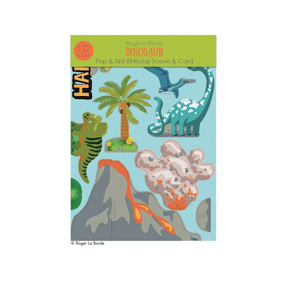 Pop & Slot – Set “Dinosaurier Geburtstag”, Grußkarte mit Umschlag und 2 Stanzbögen aus Karton mit herausnehmbaren Dinos und einem Vulkan, zum Aufstellen.