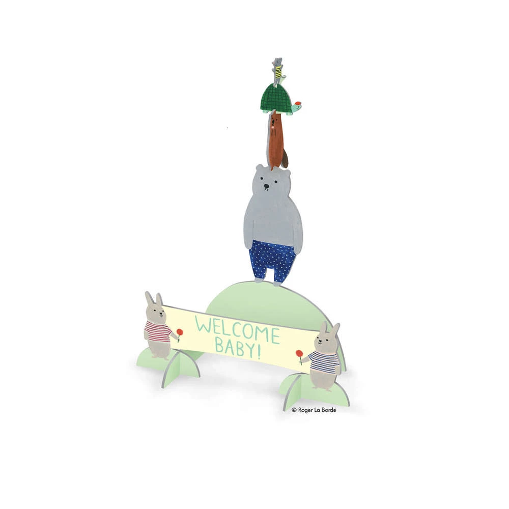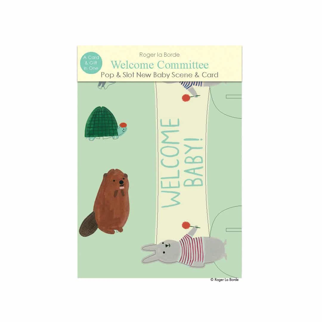 Pop & Slot – Set “Welcome Baby Comittee”, Grußkarte mit Umschlag und 2 Stanzbögen aus Karton mit herausnehmbaren Tieren, zum Aufstellen.