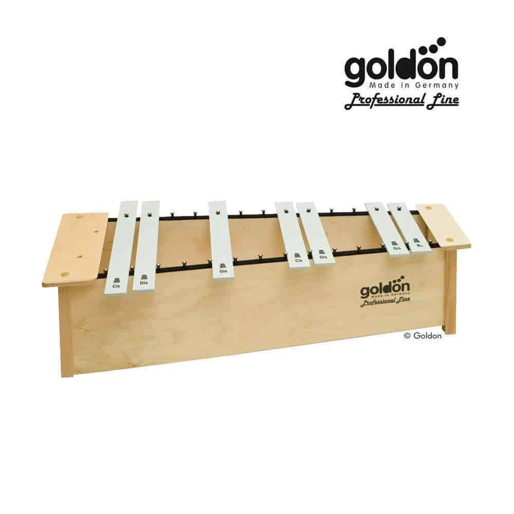 Tonumfang: Halbtöne ergänzend zum großen Alt-Metallophon mit 16 Klangplatten. Töne: cis1, dis1, gis1, cis2, dis2, gis2, bb2.