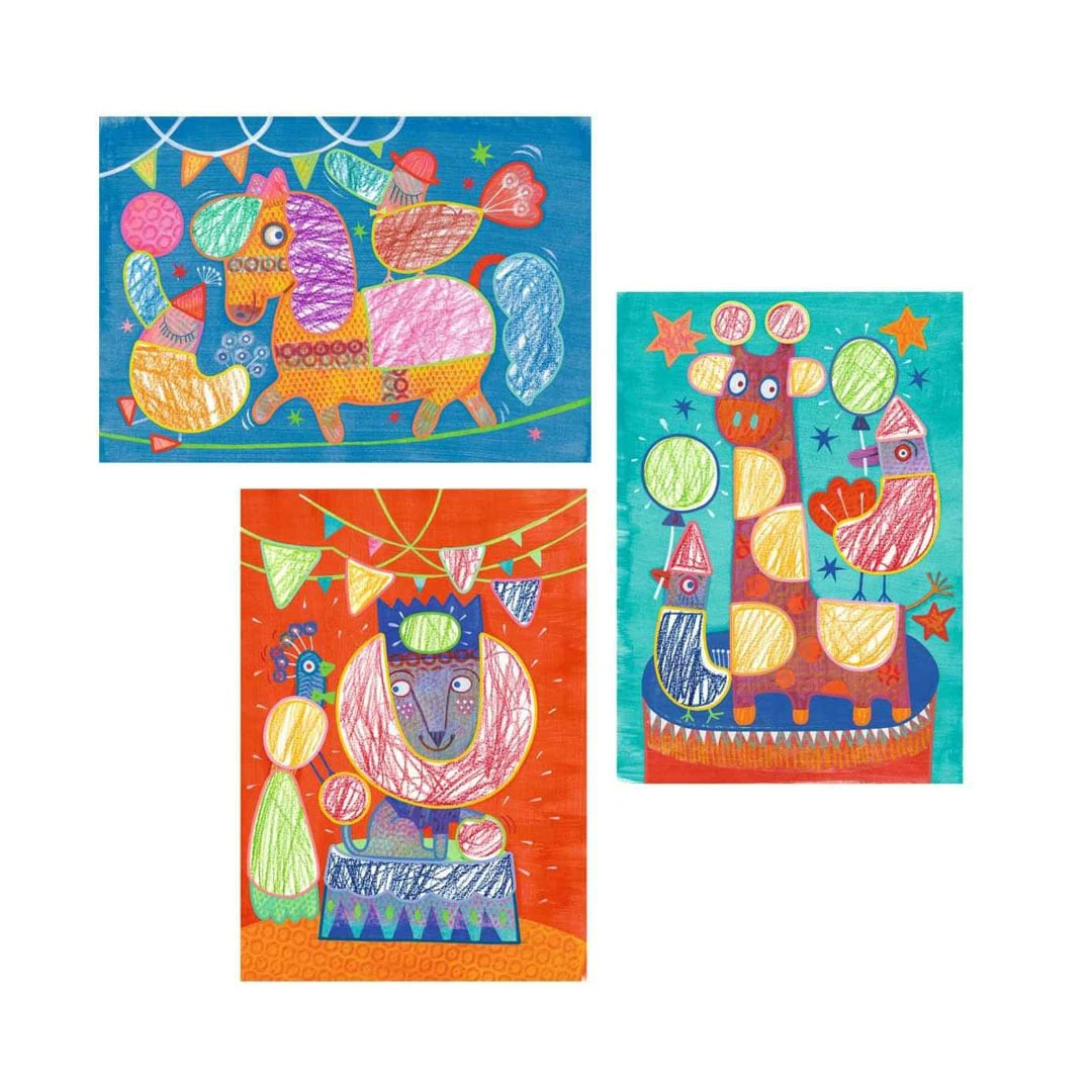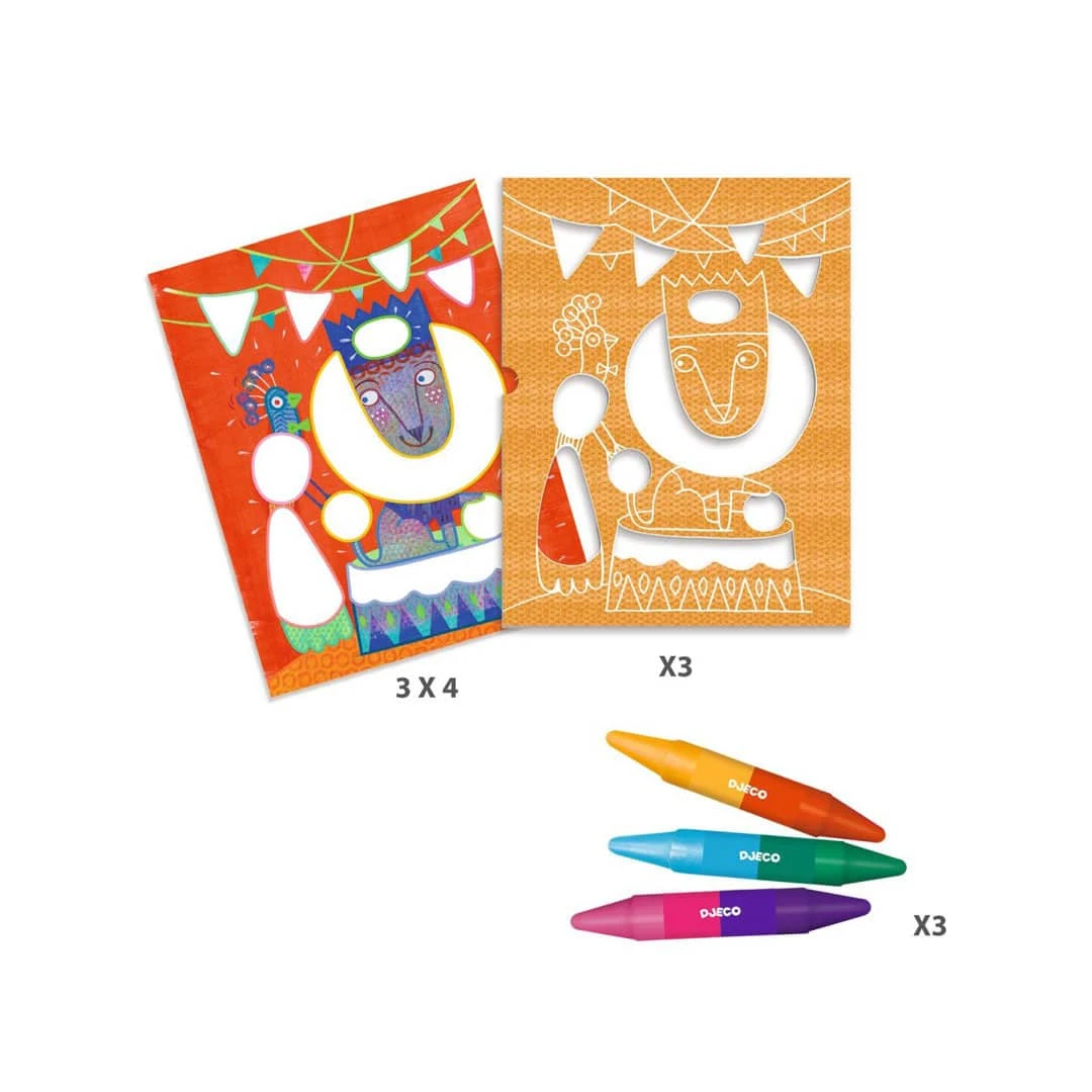 - 3 doppelseitige Wachsmalstifte (6 Farben)