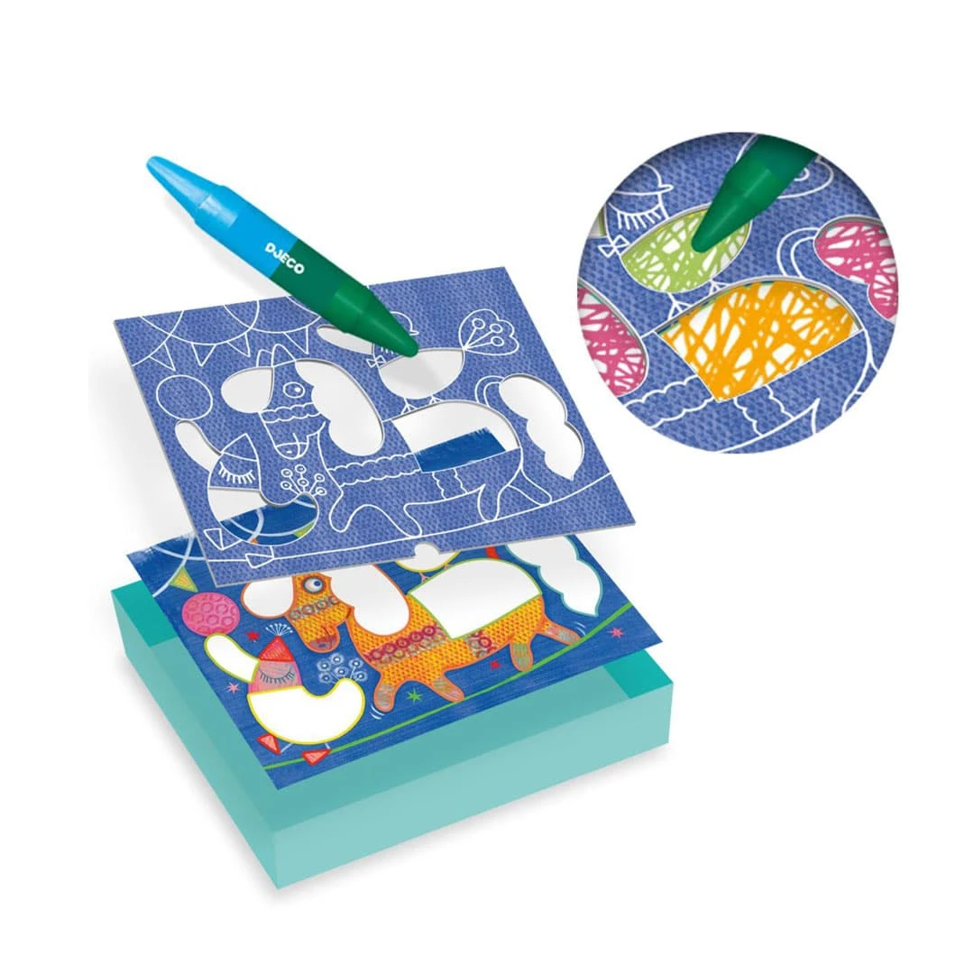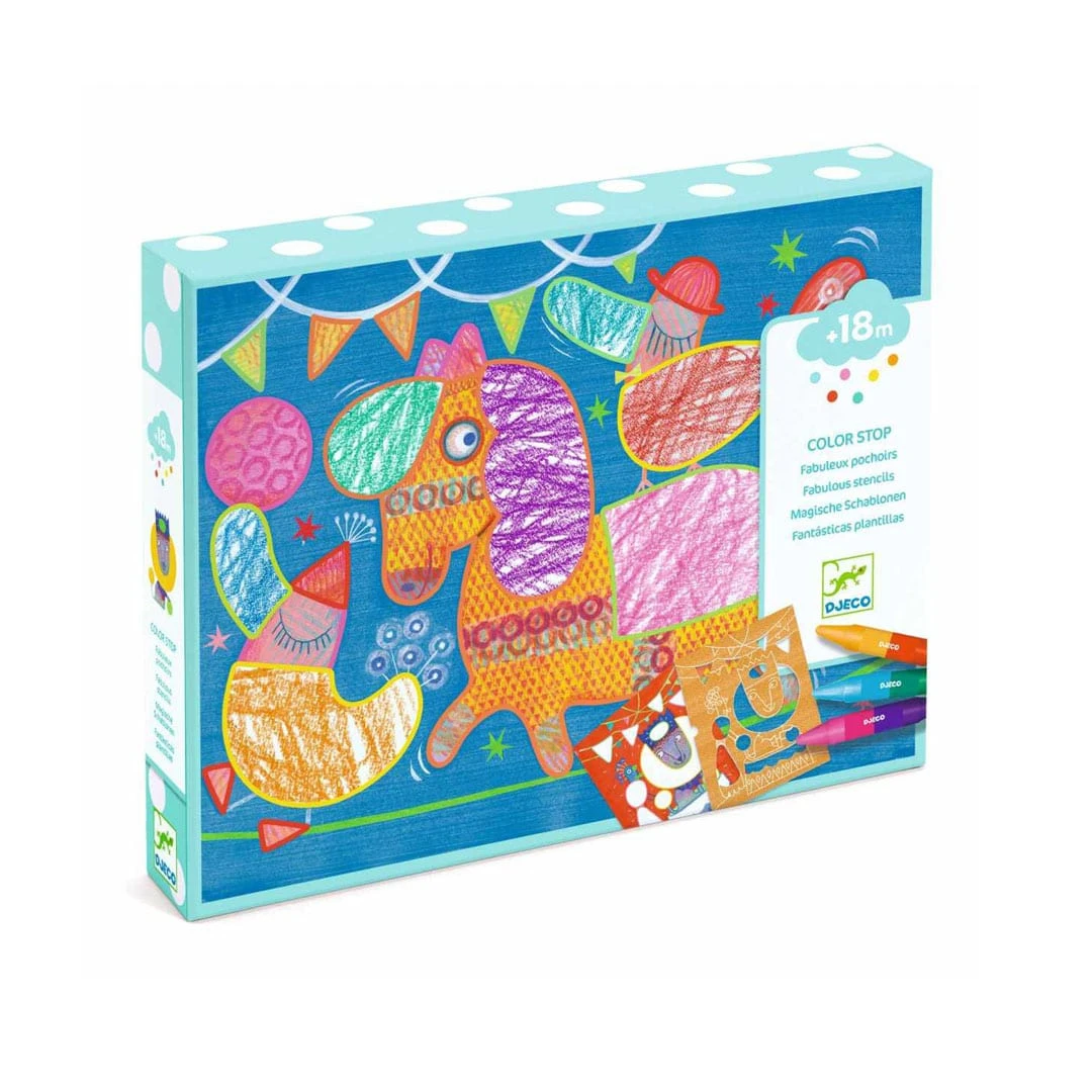 Ein erstes Malset für Kinder ab 18 Monaten: Mithilfe eines Erwachsenen wird eine Vorlage und dazu die passende Schablone in den Deckel der Schachtel gelegt. Das Kind kann dann in die Löcher malen und anschließend sehen, welche schönen Bilder entstanden sind.