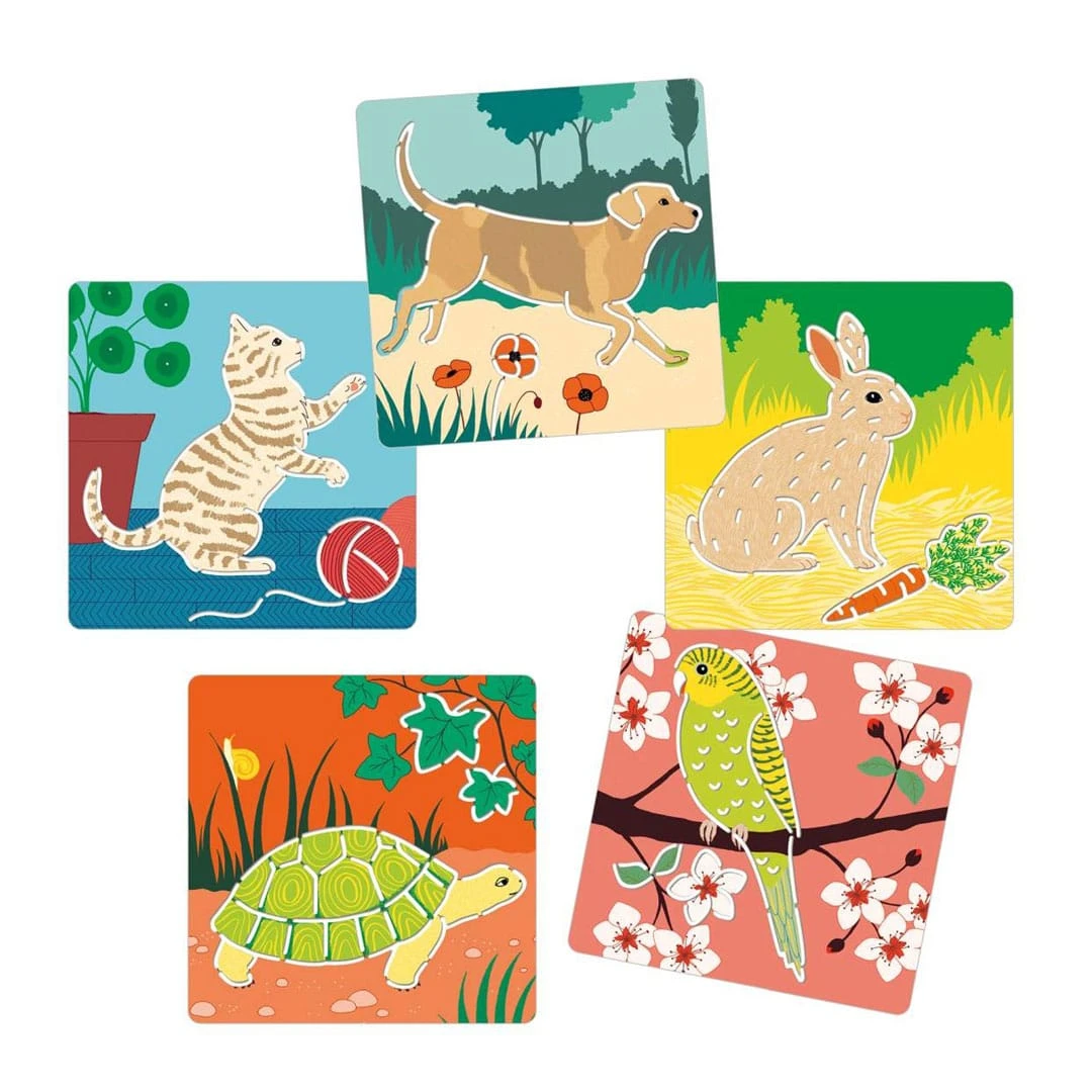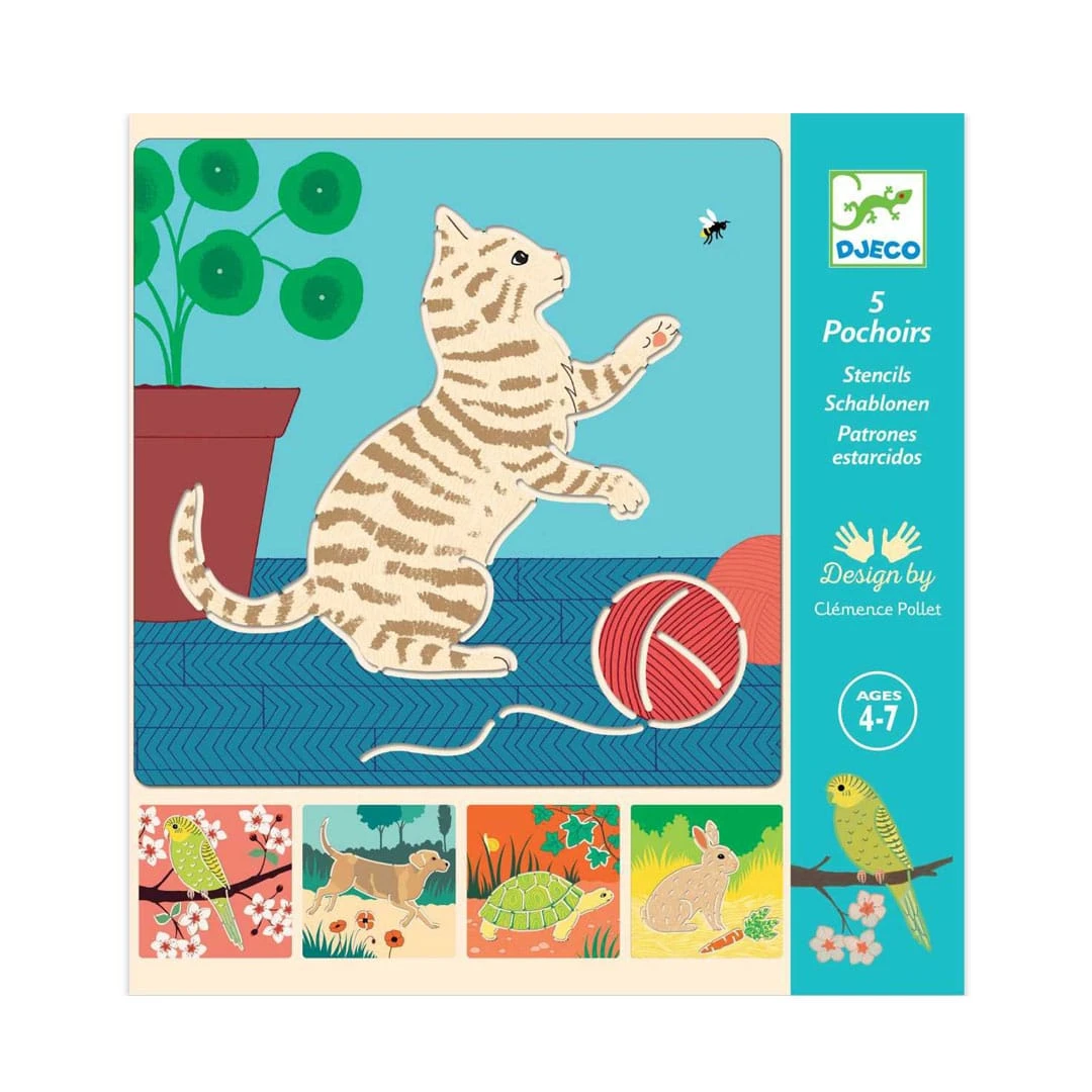 Bastelset mit 5 Schablonen mit “Süßen Gefährten” als Haustiere: Schildkröte, Kaninchen, Papagei, Hund, Katze, von Djeco.