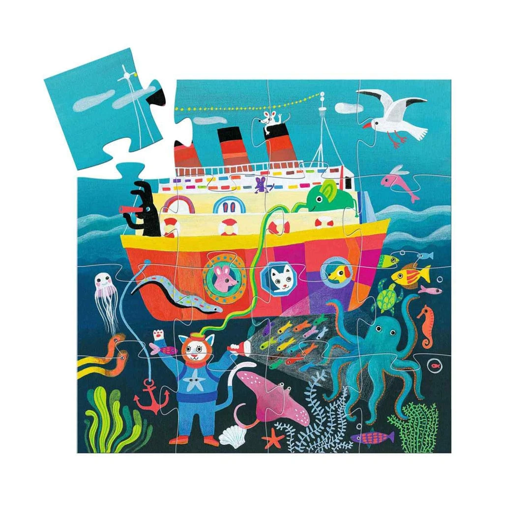 Das enthaltene Puzzle bildet das Schiff mit seinen tierischen Passagieren ab und dazu noch einen Tiefsee-Taucher umgeben von Meerestieren.