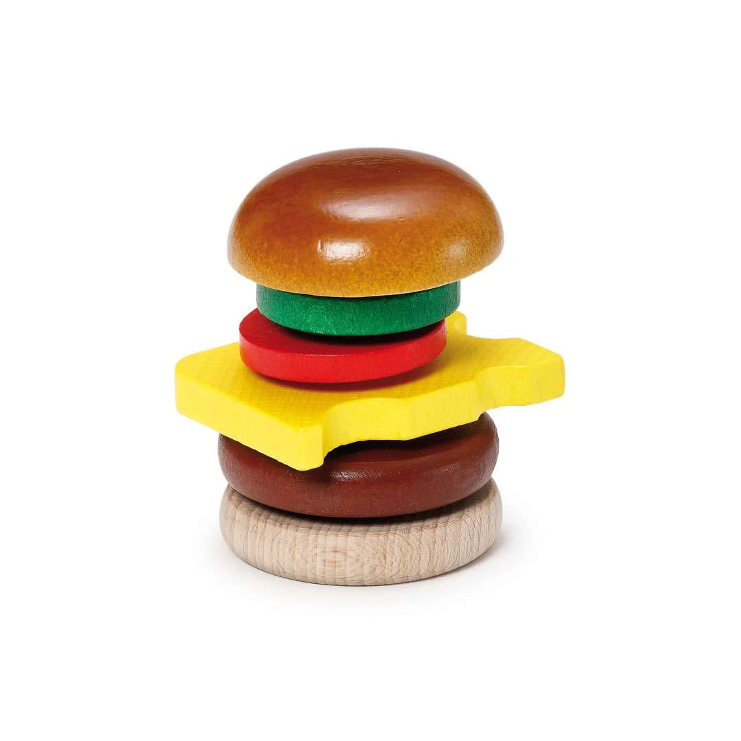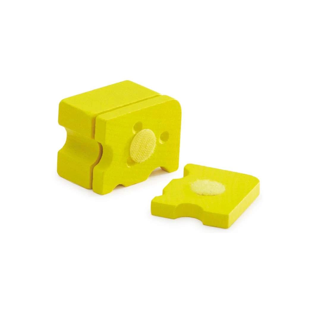 Dieses Stück Käse, z.B. Emmentaler, besteht aus 3 Teilen aus Holz, die mit Klett aneinander haften, zum Teilen und Schneiden. Die abgeschnittenen Scheiben können z.B. verwendet werden, um Spiel-Sandwiches oder z.B. Cheeseburger zu belegen. Durch den Klett haften die Einzelteile zusammen.