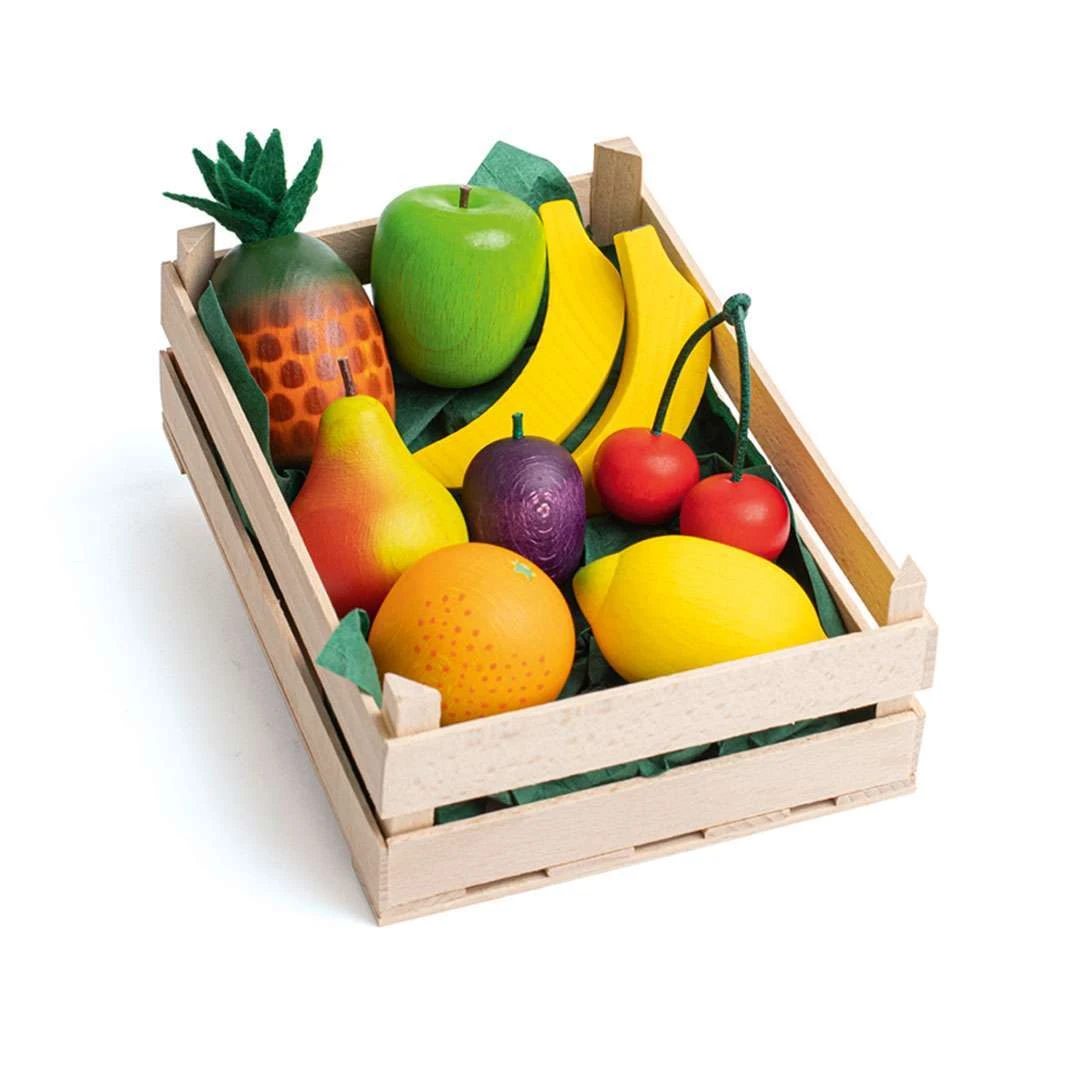 9-teiliges Obst-Sortiment aus Holz in einer großen Holzstiege, für den Kaufladen und die Kinderküche.