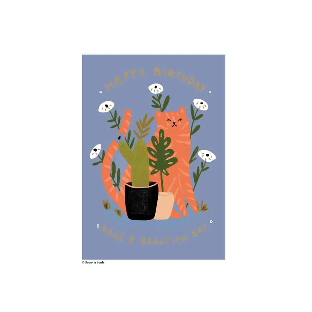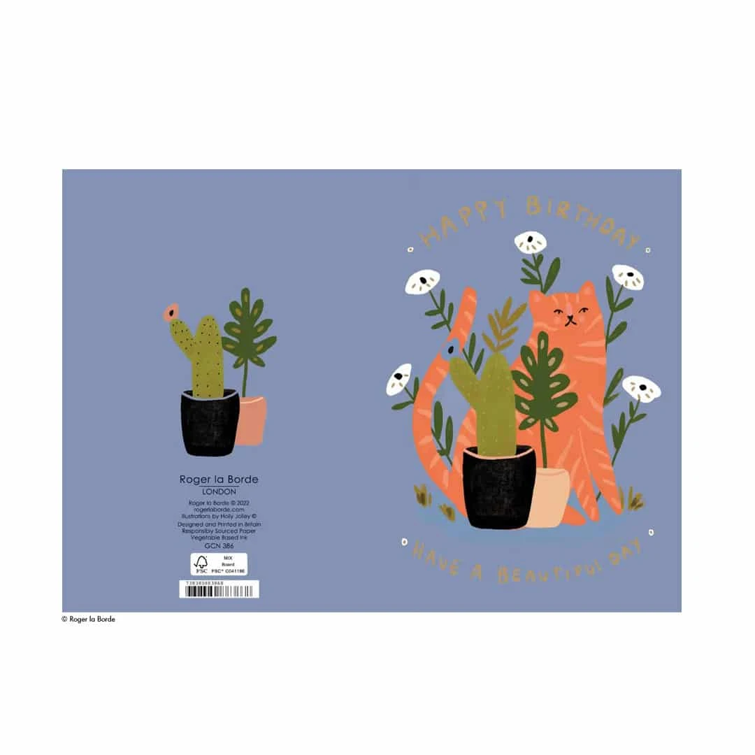 Glückwunschkarte Katze mit Kaktus “Happy Birthday”. Klappkarte mit Goldfolie und Umschlag.