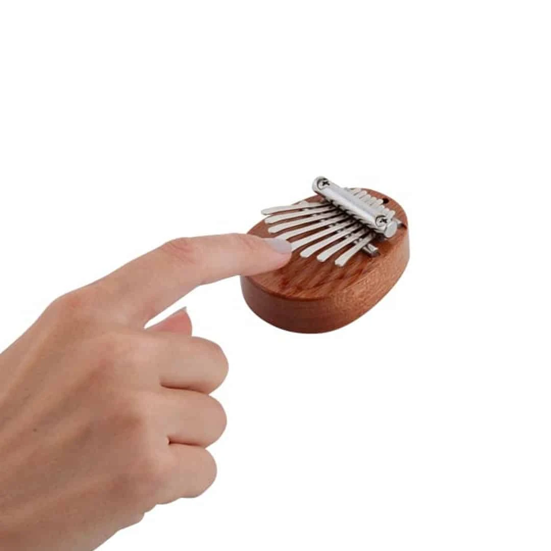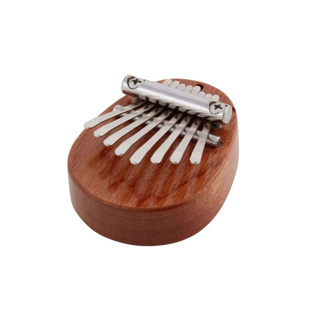 Bei dieser Kalimba sind 8 Klangzungen oder Lamellen aus Metall auf einem ovalen Holzblock befestigt und werden mit den Fingern angezupft. Die Töne können durch Vor- und Zurückschieben der Klangzungen gestimmt werden.
