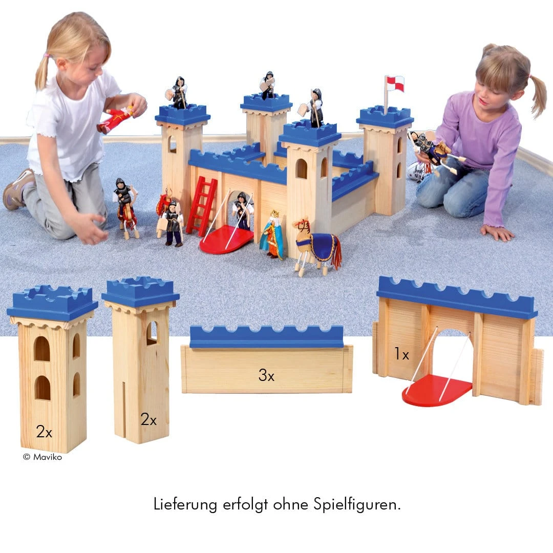 Die Dächer der vier Türme lassen sich abnehmen, so dass innen auch noch Ritterfiguren oder andere Gegenstände Platz haben. Die Türme bieten Platz für mehrere Ritterfiguren. Die blauen Wehrgänge sind innen etwas breiter, um auch dort Ritterfiguren o.ä. hineinstellen zu können.