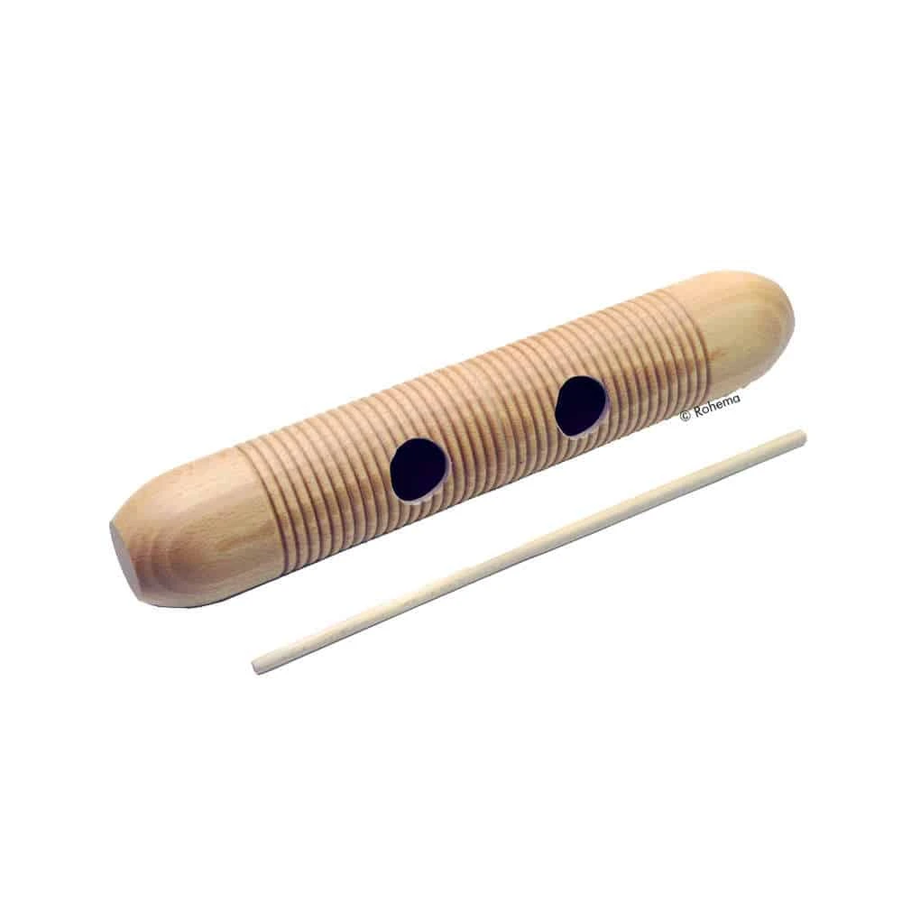 Klassisches Percussion-Instrument Guiro mit Grifflöchern und Scraper zum Scratchen.