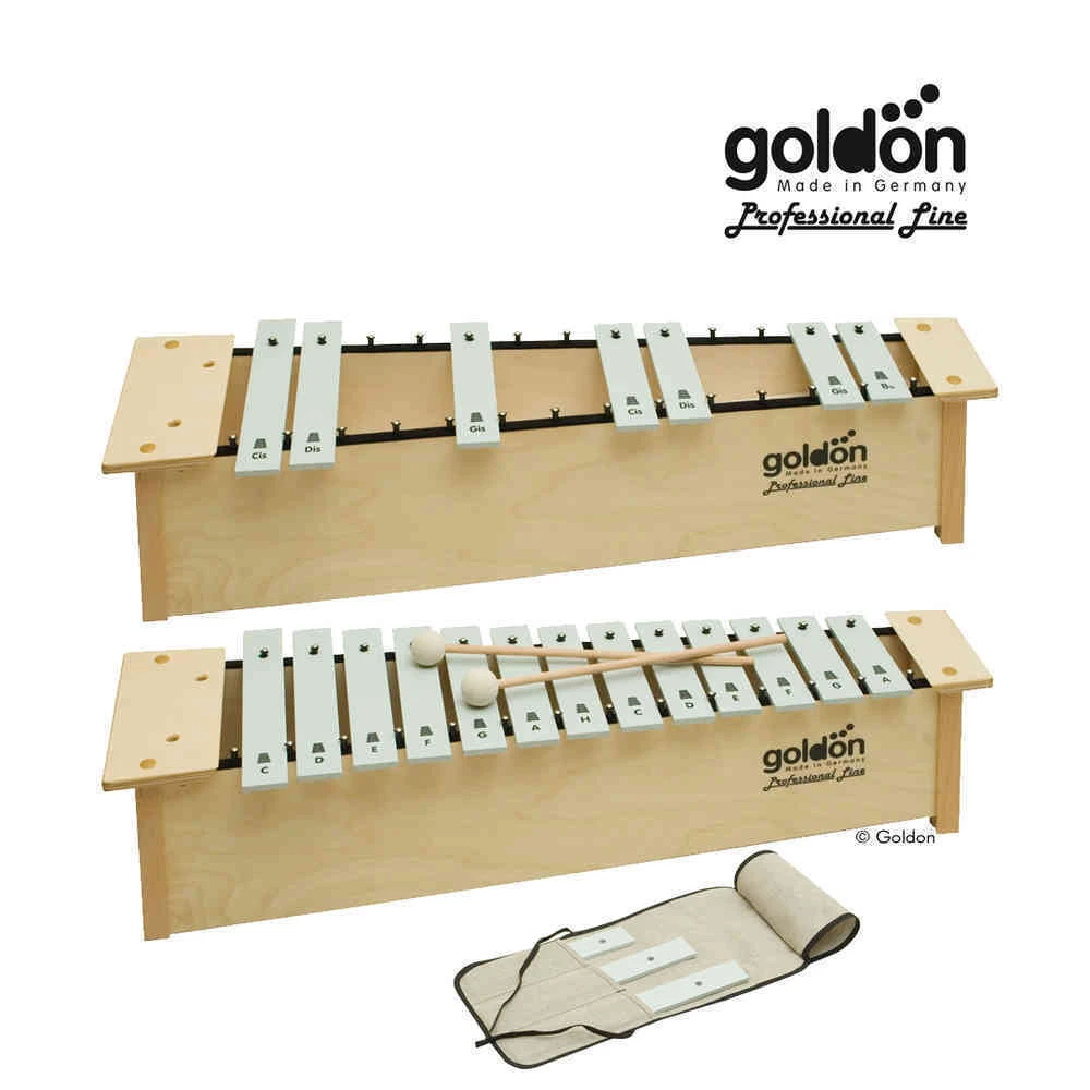 Das chromatische Sopran-Metallophon beinhaltet das große Sopran-Metallophon mit 16 Klangplatten (inkl. Schlägel und Leinentasche für Klangplatten Fis und Bb) sowie die dazugehörige chromatische Ergänzung.