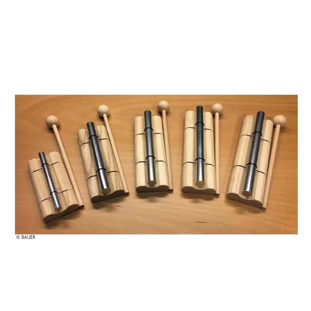 Klangstäbe oder Chime Bars werden gern in der musikalischen Früherziehung verwendet sowie auch zu therapeutischen Zwecken in der Musiktherapie und anderswo. Diese Klangstäbe stammen aus deutscher Fertigung. Die gestimmten Aluminium-Stäbe werden mittels einerbesonderen Technik schwebend auf einen geschliffenen Holzkorpus aus Eschenholz gespannt. Der beeindruckende Nachklang der Klangstäbe entsteht durch ihre besondere Materialhärte und die hohe Oberflächenvergütung. Schon durch leichtes Anschlagen mit dem Holzklöppel entsteht ein klarer, heller und lange anhaltender Ton.