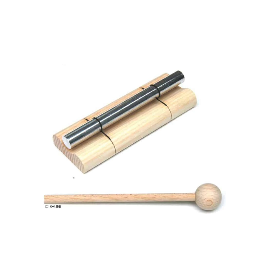 1 Klangstab aus Aluminium, auf Holzblock befestigt, mit Schlägel. Töne D – E – G – A – H.