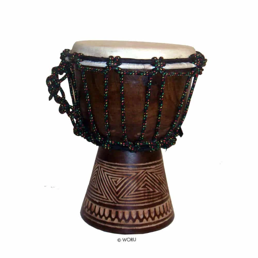 Eine Djembe ist eine “Bechertrommel” und stammt ursprünglich aus Westafrika. Die Trommel wird aus einem ausgehöhlten Baumstamm gefertigt und ist mit geschorenem Ziegenfell, also genauer gesagt: Ziegenhaut, bespannt. Die Djembe wird nur mit den Händen angeschlagen. Dabei erreicht sie ein differenziertes Klangspektrum, durch ihre spezielle Becherform hat sie einen tiefen Bass-Klang bei Schlag auf die Mitte des Fells und höhere Töne, je nachdem, wo und wie sie mit den Händen angeschlagen wird. Das reicht bis hin zu Klackertönen durch Anschlagen auf den Rand der Trommel.