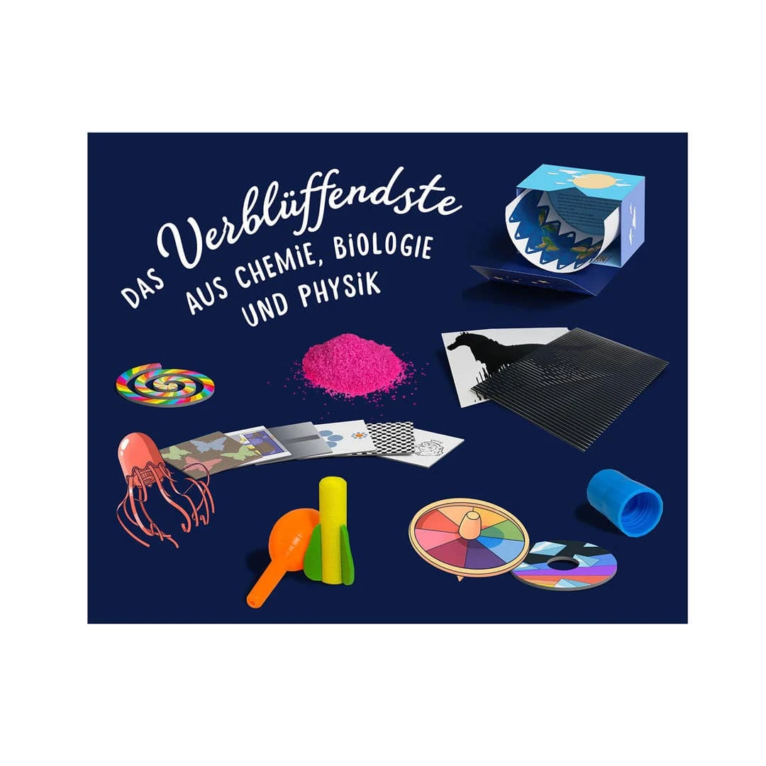 Inhalt: Flaschentornado, Ph-Papier, Cartesischer Taucher, Multispektral-Folie, Facettenlinse, Raketenset, magischer Fisch, optische Illusionen uvm.