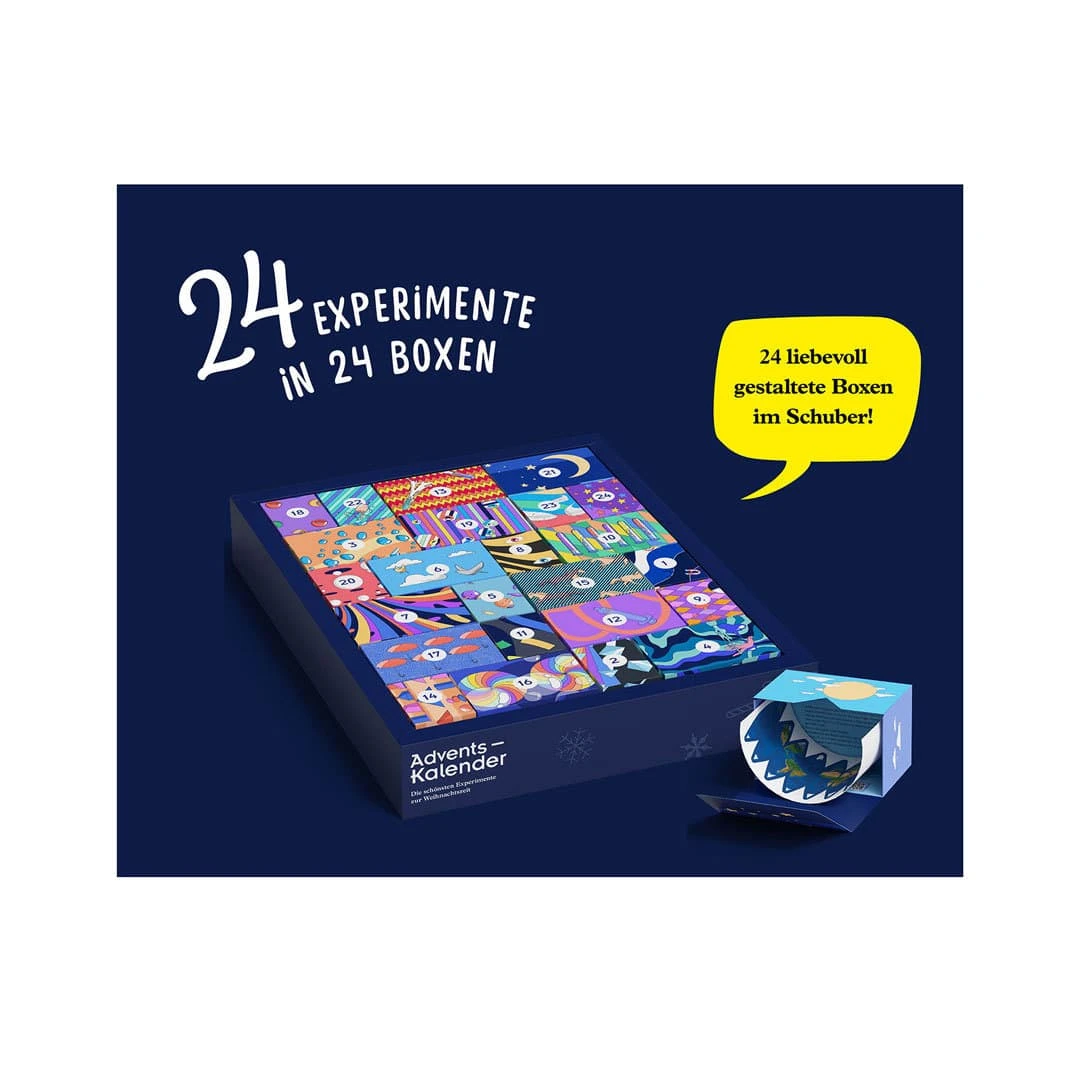 Ein Adventskalender für schlaue Köpfe und wissbegierige Forscher, mit 24 kleinen Boxen mit je einem weihnachtlichen Experiment, vom KOSMOS-Verlag.