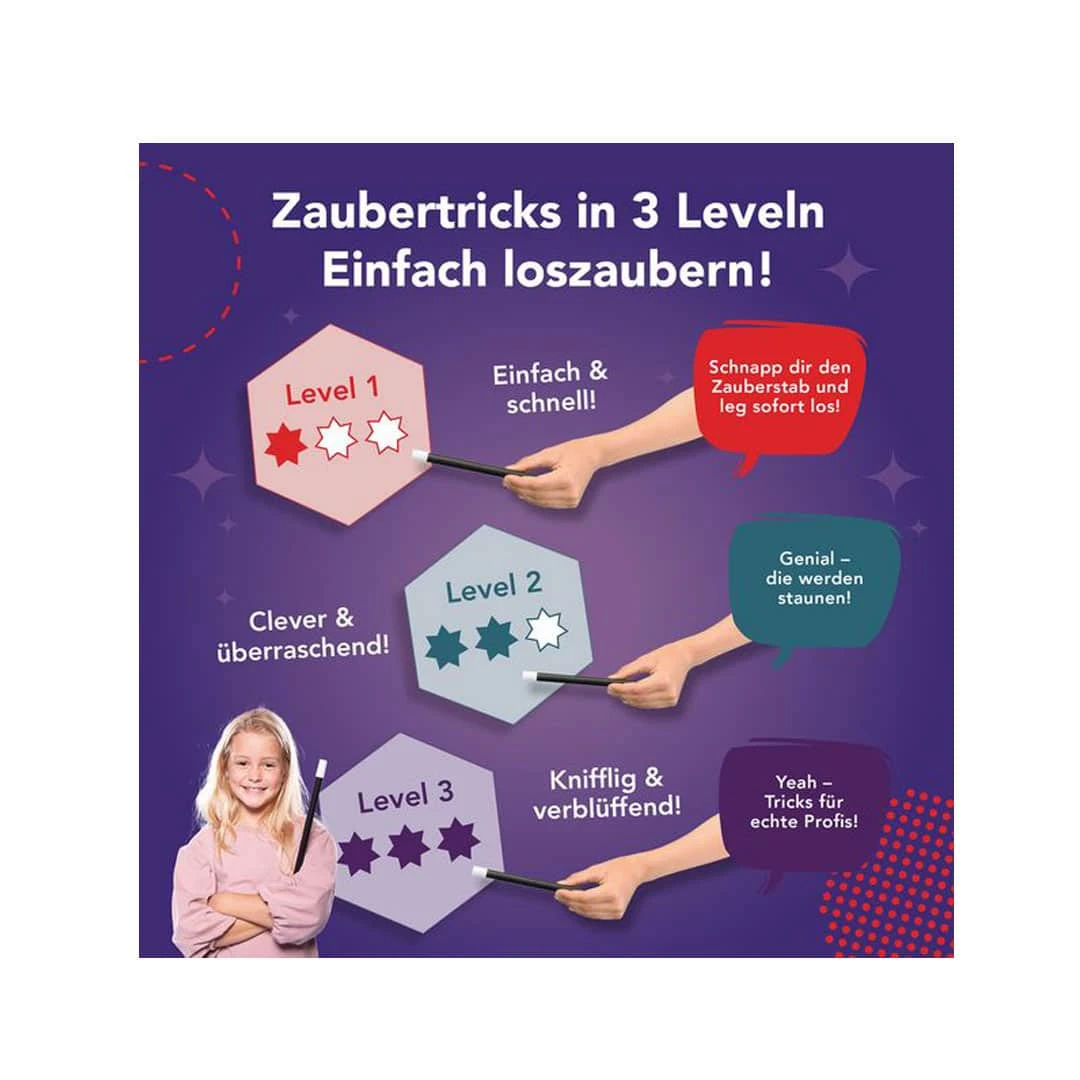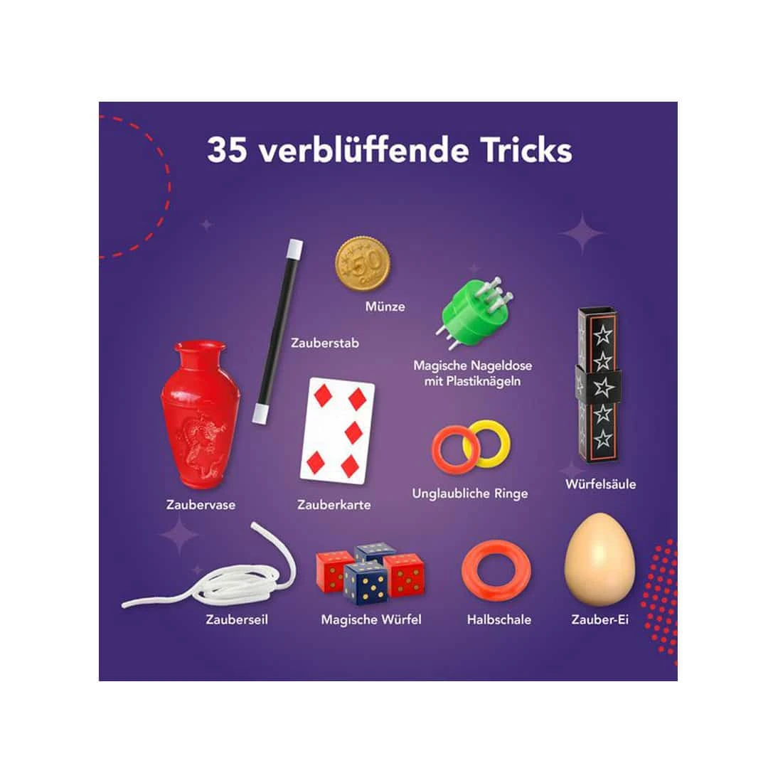 In diesem Zauberer-Set sind magische Utensilien für 35 verblüffende Zaubertricks für 3 Schwierigkeits-Levels für Kinder ab 8 Jahren enthalten. Dank der ausführlichen Bild-für-Bild-Anleitung ist dies die ideale Ausstattung für den Einstieg in die Welt der Magie.