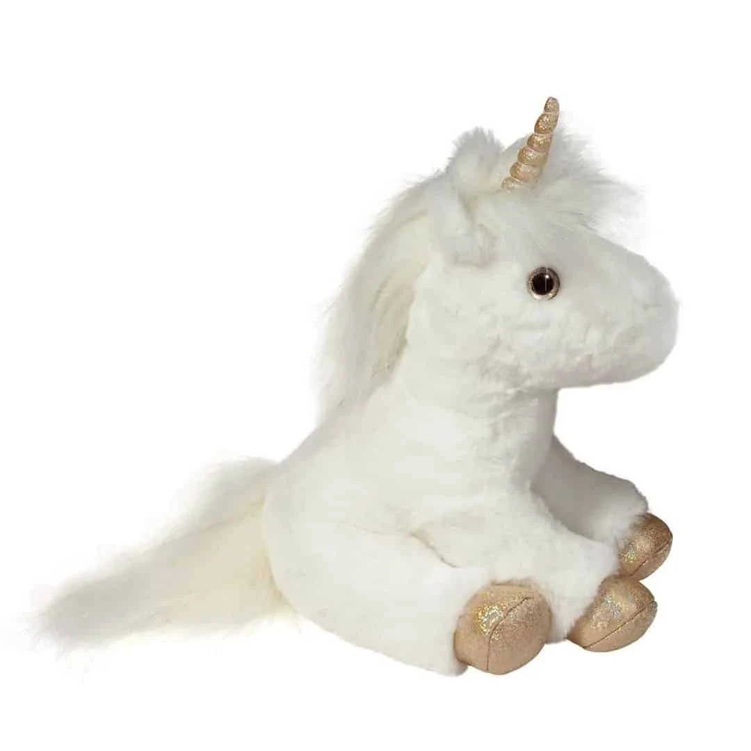 Kuscheltier weißes Einhorn “Elodie”, sitzend, mit goldenem Horn und Hufen. Superweiches, superflauschiges Plüschtier mit Glasaugen,