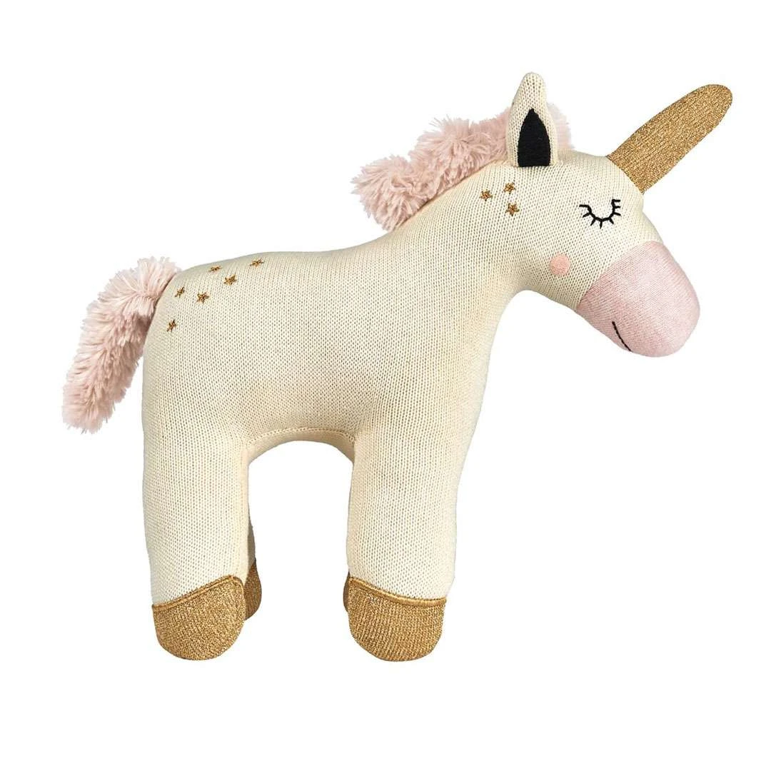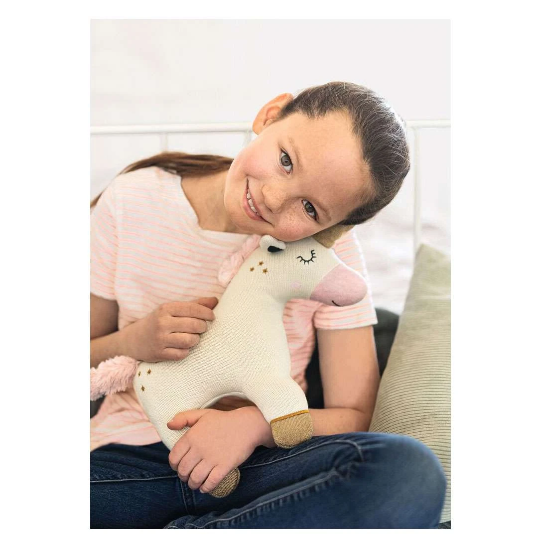 Ein supersüsses, weißes, weiches Stofftier ist dieses Strick-Einhorn “Sternenstaub” mit Goldglitzer, das zur besten Freundin werden kann und Trost und Freude spendet. Das kuschelige Einhorn ist mit vielen gehäkelten Details ausgestattet.