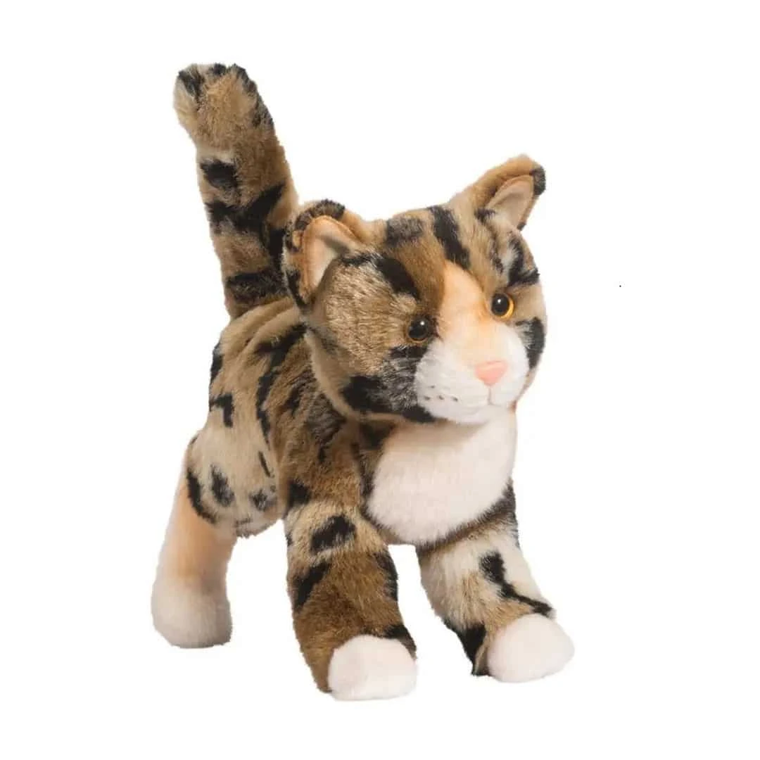 Großes Kuscheltier Bengalische Tigerkatze “Tashette” stehend, mit weichem, braun-weiß getigertem Fell und Glasaugen,