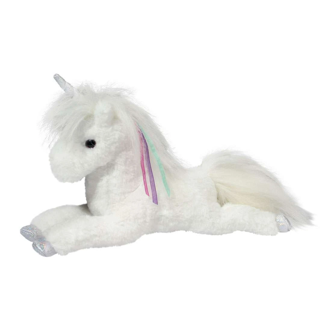 Kuscheltier weißes Glitzer-Einhorn, liegend. Superweiches, flauschiges Plüschtier mit Glitzer,