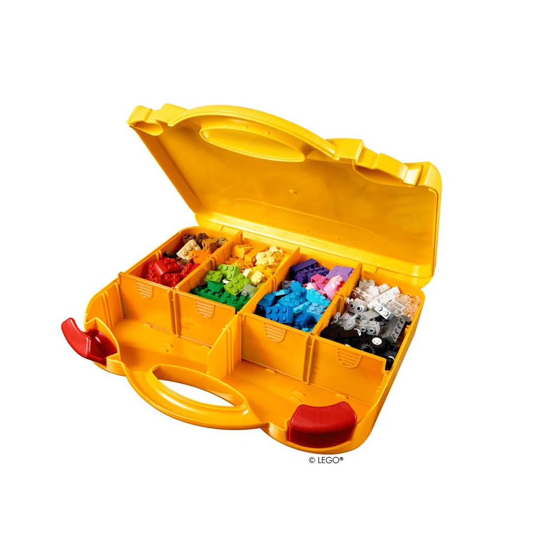Dieser solide Koffer mit praktischen Fächern enthält eine Vielzahl sehr unterschiedlicher LEGO® Steine in vielen Farben, Formen, Räder und Augen.