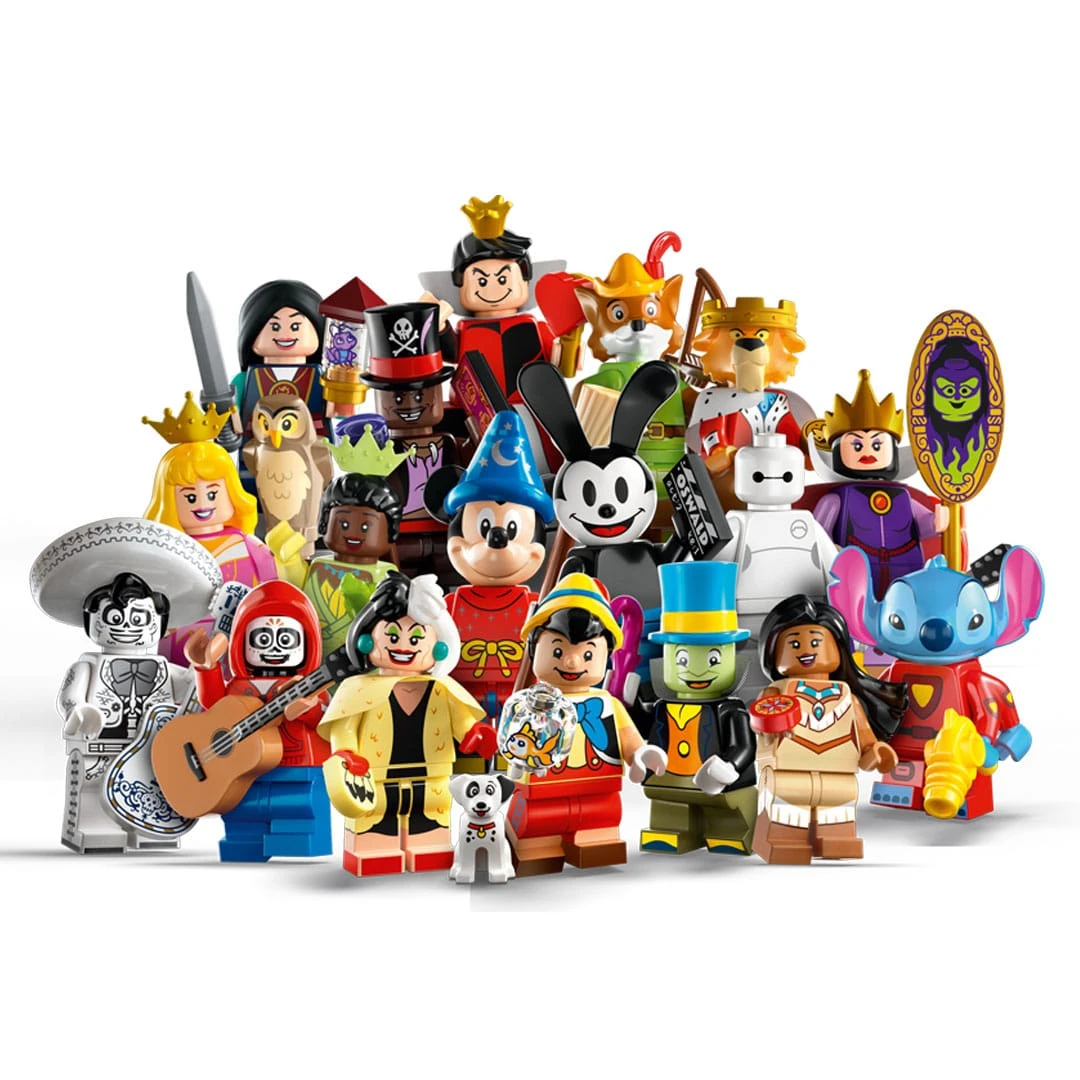 Überraschungstüte mit einer von 18 einzigartigen LEGO-Disney-Minifiguren. Dabei befindet sich in jeder fest verschlossenen Tüte zusammen mit der jeweiligen limitierten Minifigur ein oder mehr Zubehörteile sowie eine Sammlerbroschüre mit Informationen zum jeweiligen Charakter und eine Stellplatte für unterschiedliche Posen der Figur.