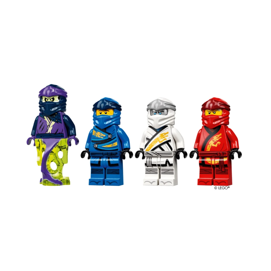 Dieses LEGO® Ninjago® Bausteinset enthält den Ninja-Flugsegler mit Foliensegel, rotierenden Triebwerke, Steuerrad, sowie einem abnehmbaren Wassermotorrad und einem Anker an der Kette. Dazu gibt es vier Minifiugren: die Ninja Kai, Zane und Jay sowie den gefährlichen Geisterninja Karenn. Außerdem enthalten ist ein Drache, dessen Flügel auf Knopfdruck schlagen können, und auf dessen Sattel die Ninja-Minifiguren reiten können.