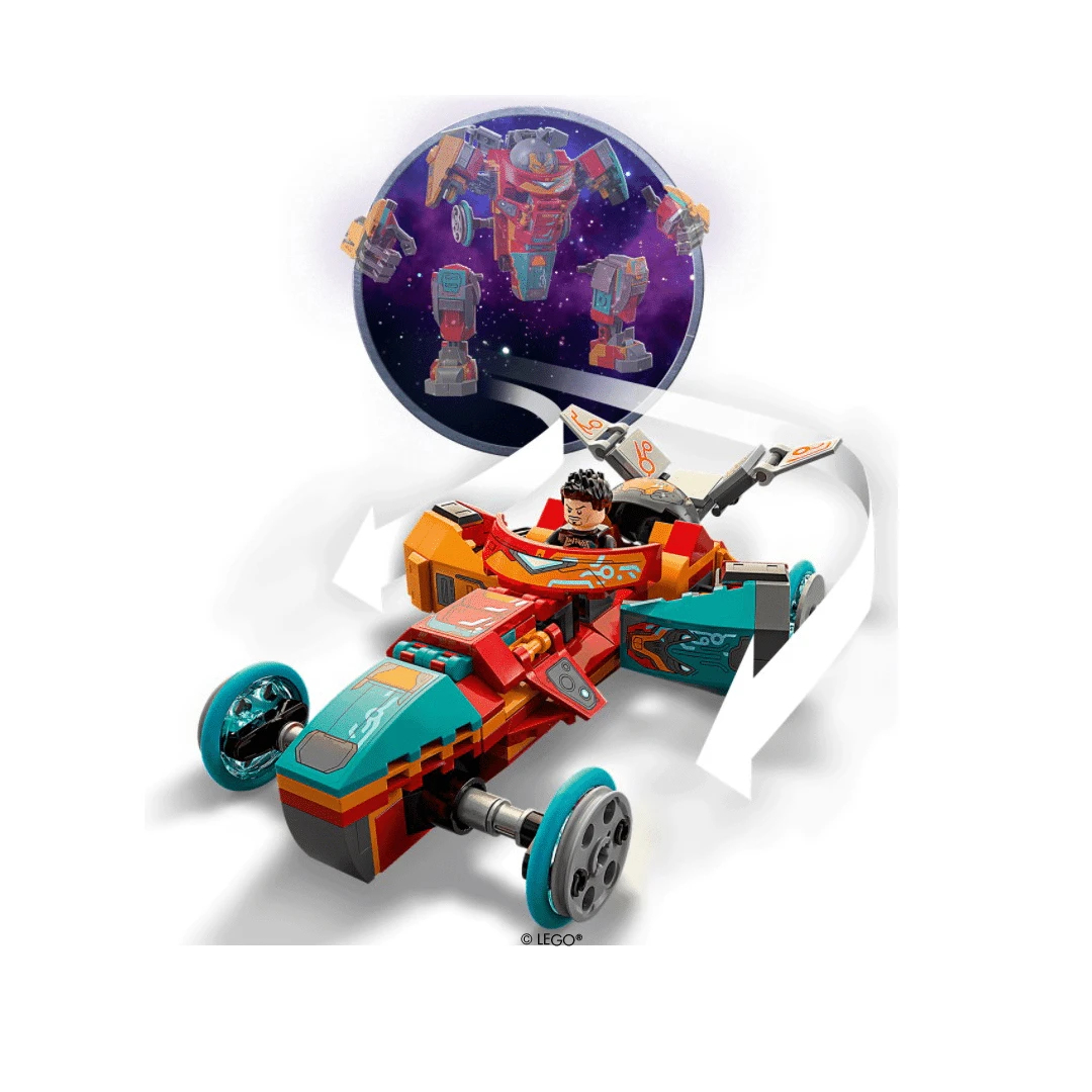 Dieses LEGO® Marvel Superhelden-Bausteinset enthält die Minifiguren Tony Stark, Valkyrie und den Watcher. Außerdem enthalten ist ein Mech, der sich in ein sportliches Rennauto umbauen lässt. Die Minifiguren lassen sich in den beweglichen Mech hineinsetzen.