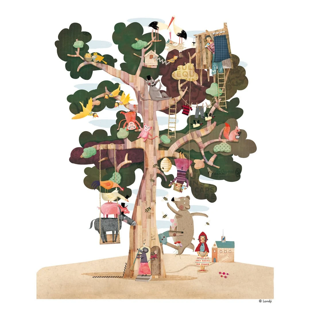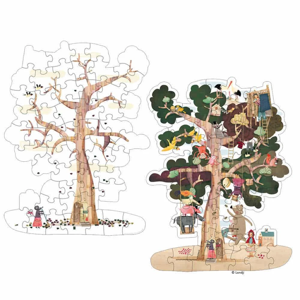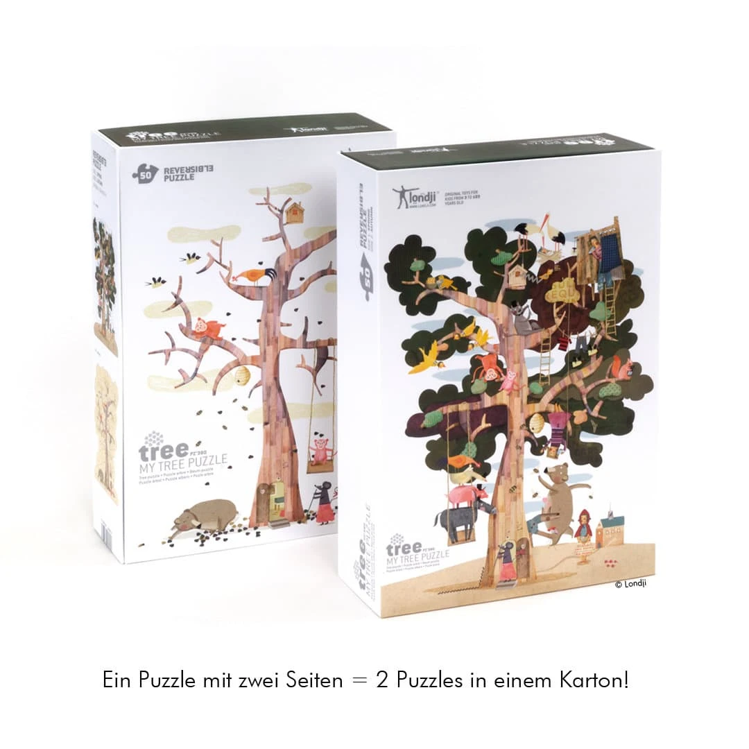 Riesiges Bodenpuzzle mit 50 Teilen, bestehend aus recycelter Pappe. Ein extragroßes Puzzle, das auf Vorder- und Rückseite jeweils denselben Baum im Frühling und im Herbst darstellt. Dazu kann das bunte Treiben im Baum bewundert werden, es können allerlei Märchenfiguren gefunden und benannt werden…. da sind Rotkäppchen und der Wolf, die Bremer Stadtmusikanten und jede Menge weitere Baumhaus-Bewohner. Wer findet sie alle?