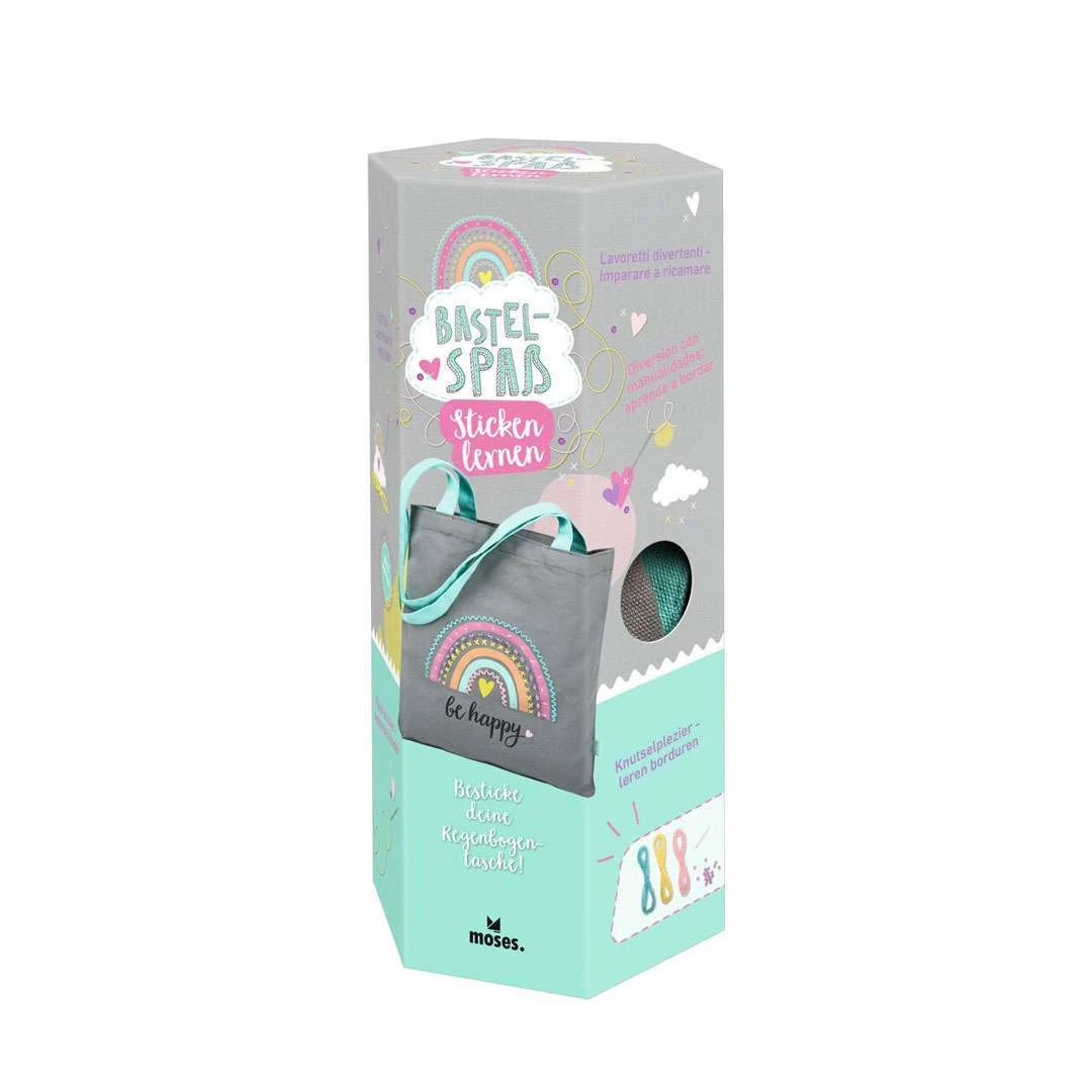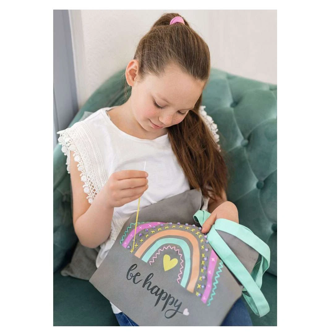 In diesem Set ist alles enthalten, was Du zum Sticken lernen brauchst, inklusive einer vorgedruckten Baumwolltasche mit Regenbogenmotiv, die Du besticken kannst.