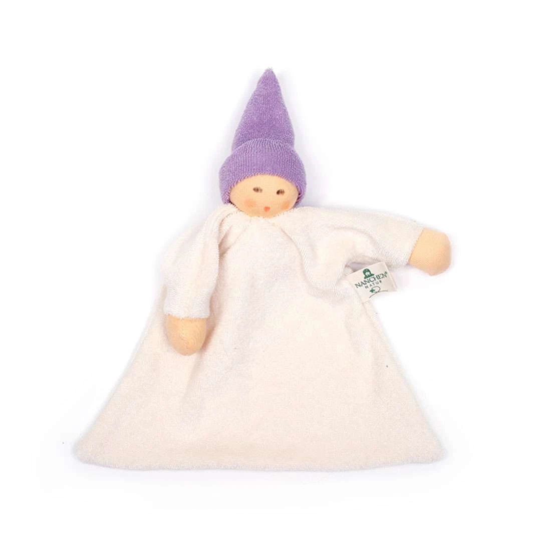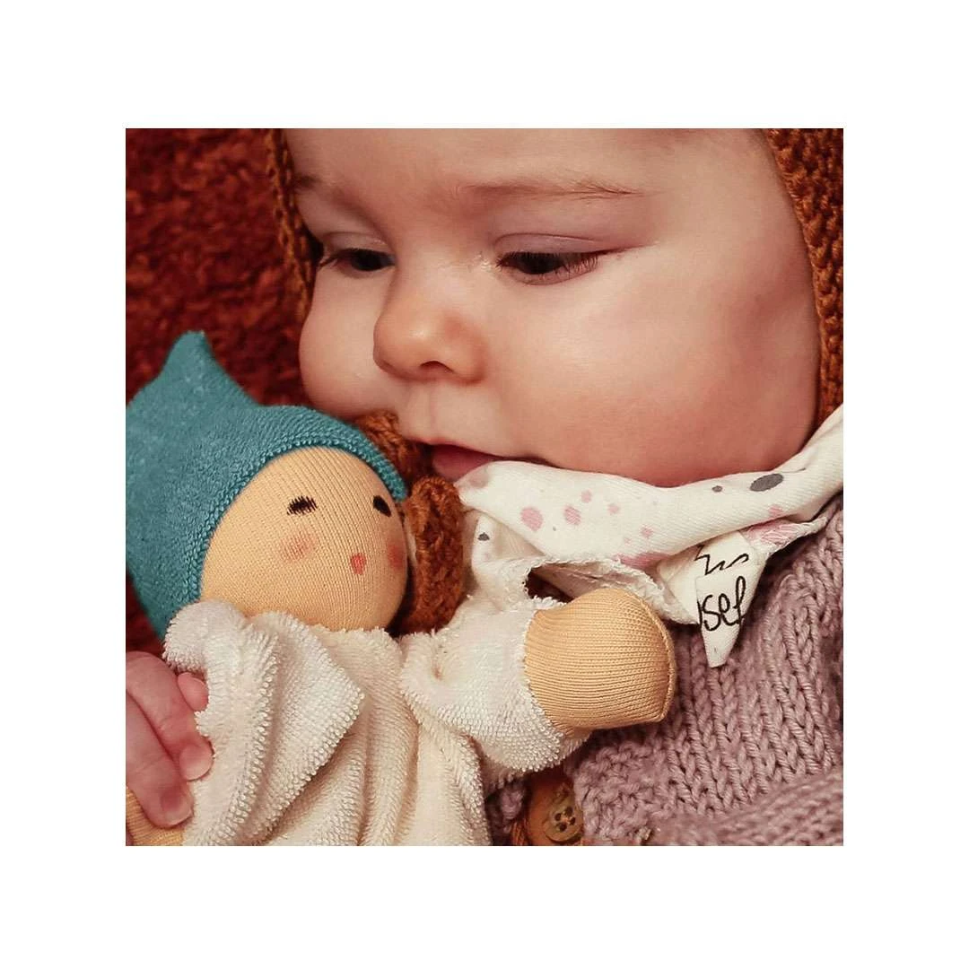 Diese Baby-Puppe ist ein naturbelassenes Schnuffeltuch mit süßem Puppenkopf, den ein buntes Mützchen schmückt. Zum Greifen und Anschmiegen geeignet.