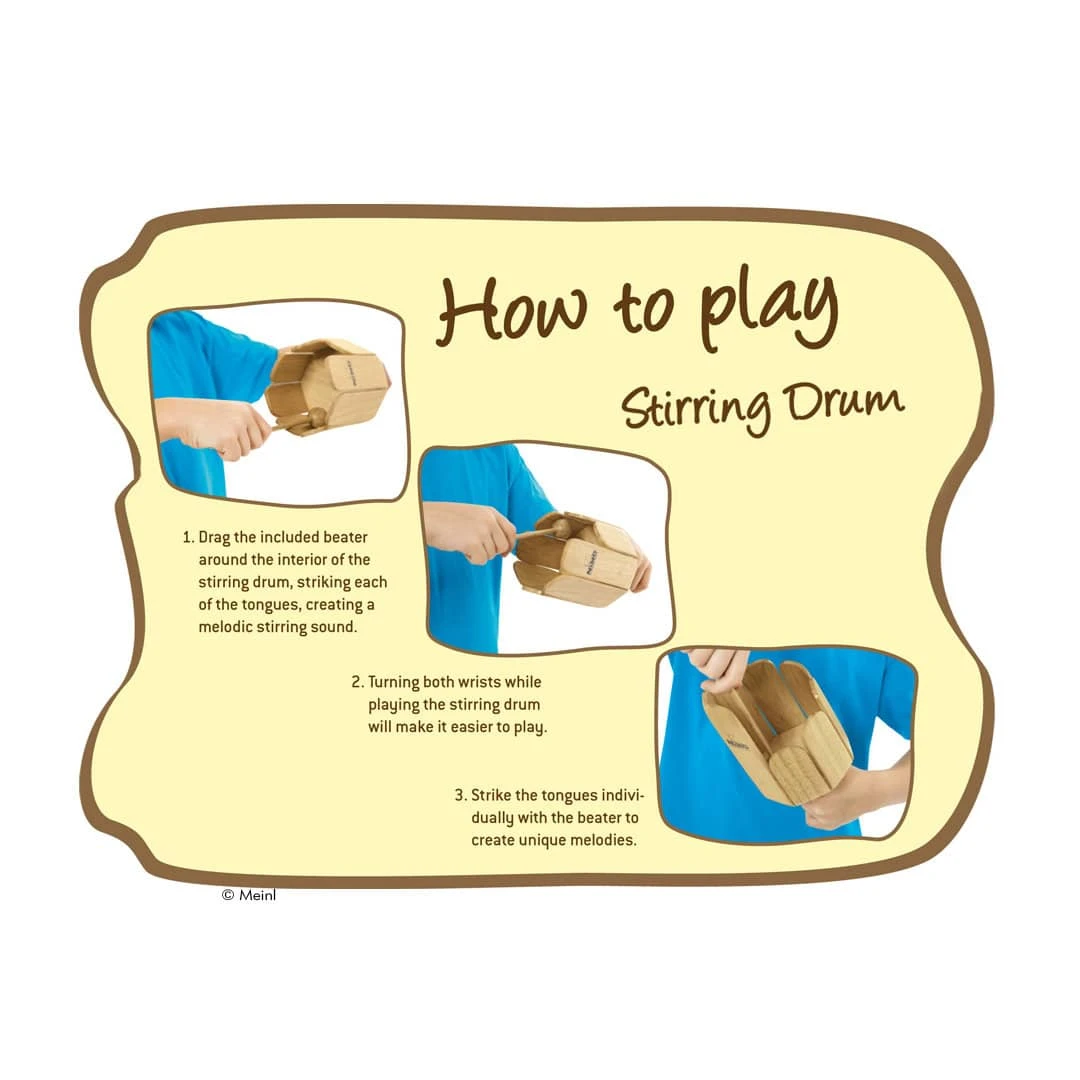 Einzeln angeschlagen können die Einzeltöne der acht hölzernen Klangzungen gespielt werden, ähnlich dem Xylophon. Durch “Rühren” mit dem Holzschlägel in der Trommel kann eine Tonleiter gespielt werden.