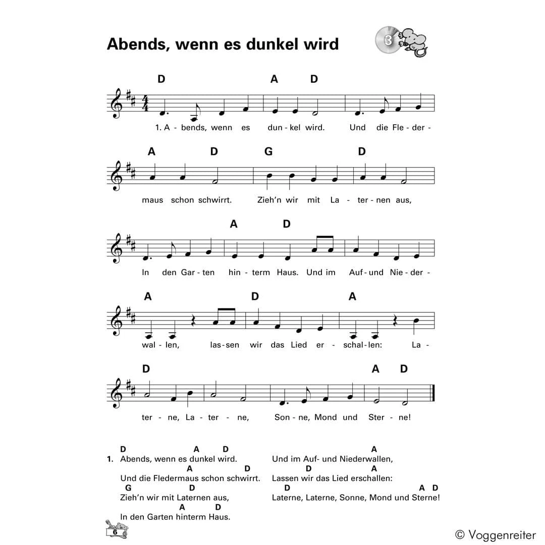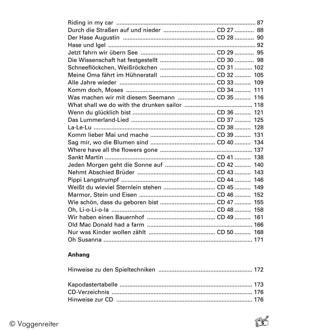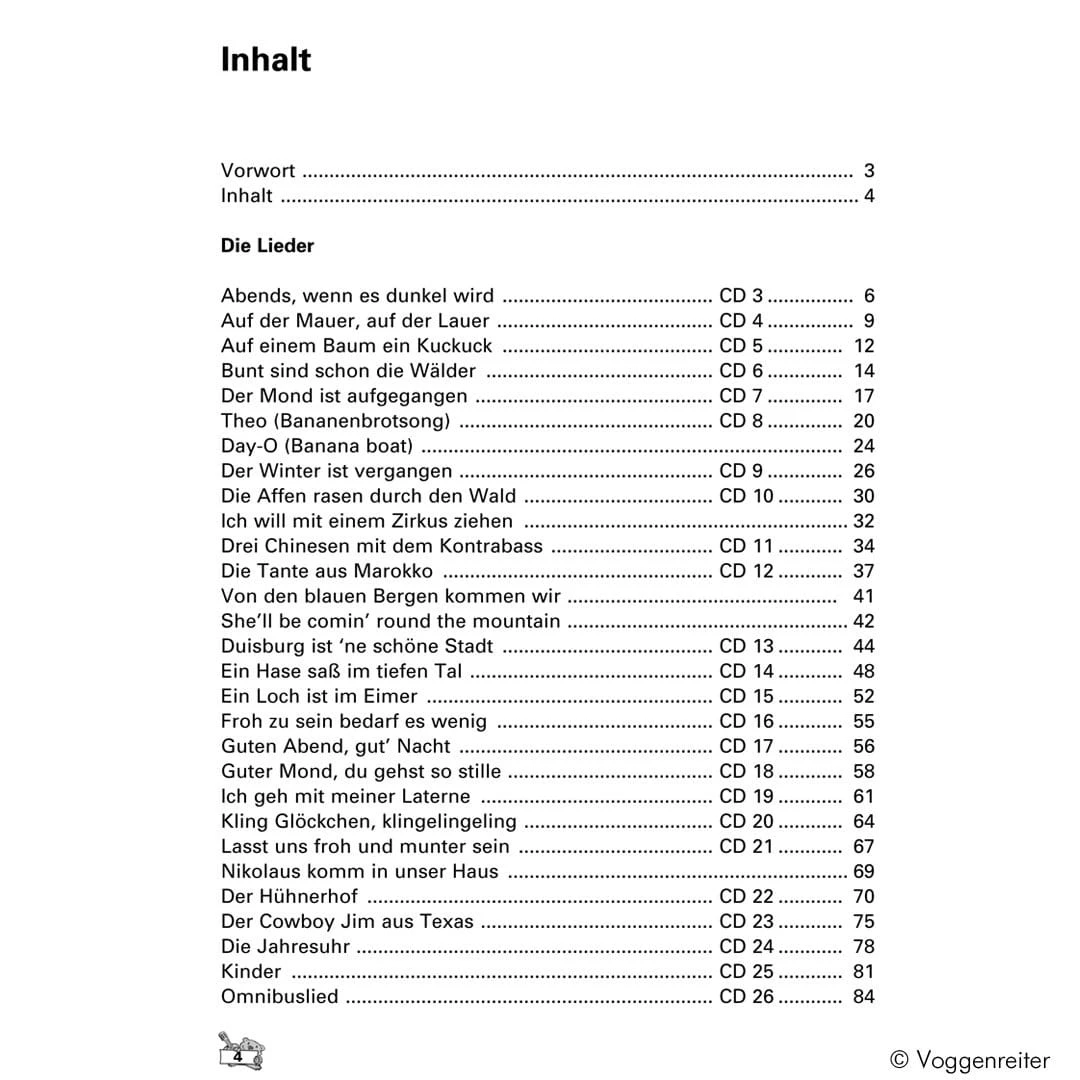 Abends, wenn es dunkel wird; Auf der Mauer, auf der Lauer; Auf einem Baum ein Kuckuck saß; Bunt sind schon die Wälder; Der Mond ist aufgegangen; Theo (Bananenbrotsong); Day-O (Banana boat); Der Winter ist vergangen; Die Affen rasen durch den Wald; Ich will mit einem Zirkus ziehen; Drei Chinesen mit dem Kontrabass; Die Tante aus Marokko; Von den blauen Bergen kommen wir; She’ll be comin’ round the mountain; Duisburg ist ’ne schöne Stadt; Ein Hase saß im tiefen Tal; Ein Loch ist im Eimer; Froh zu sein bedarf es wenig; Guten Abend, gut’ Nacht; Guter Mond, du gehst so stille; Ich geh mit meiner Laterne; Kling Glöckchen, klingelingeling; Laßt uns froh und munter sein; Nikolaus komm in unser Haus; Der Hühnerhof; Der Cowboy Jim aus Texas; Die Jahresuhr; Kinder; Omnibuslied; Riding in my car; Durch die Straßen auf und nieder; Der Hase Augustin; Hase und Igel; Jetzt fahrn wir übern See; Die Wissenschaft hat festgestellt; Schneeflöckchen, Weißröckchen; Meine Oma fährt im Hühnerstall; Alle Jahre wieder; Komm doch, Moses; Was machen wir mit diesem Seemann; What shall we do with the drunken sailor; Wenn du glücklich bist; Das Lummerland-Lied; La-le-Lu; Komm lieber Mai und mache; Sag mir, wo die Blumen sind; Where have all the flowers gone; Sankt Martin; Jeden Morgen geht die Sonne auf; Nehmt Abschied Brüder; Pippi Langstrumpf; Weißt du wieviel Sternlein stehen; Marmor, Stein und Eisen; Wie schön, dass du geboren bist; Oh, Li-o-Li-o-la; Wir haben einen Bauernhof; Old Mac Donald had a farm; Nur was Kinder wollen zählt; Oh Susanna.