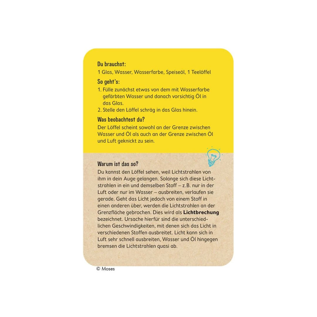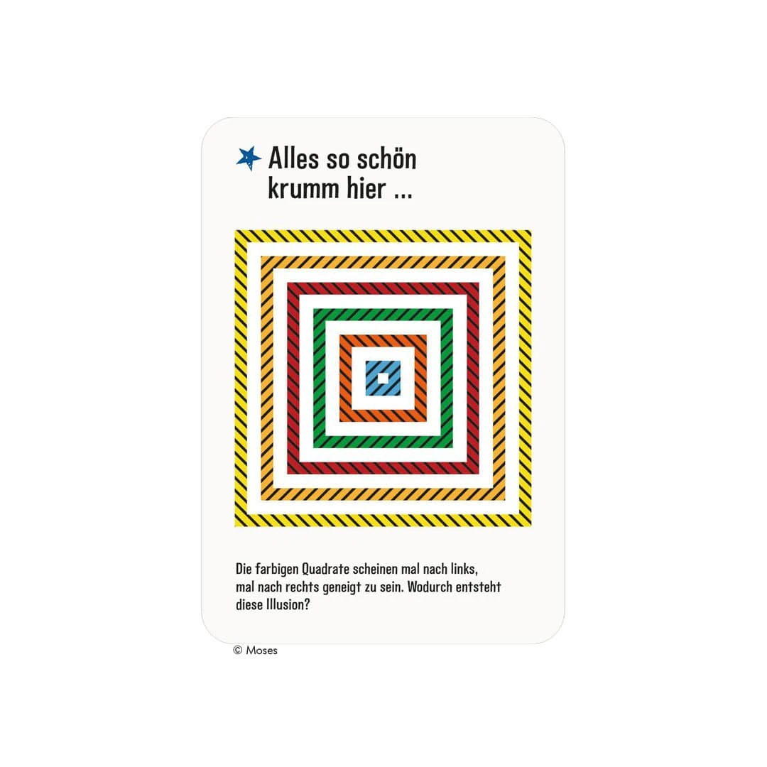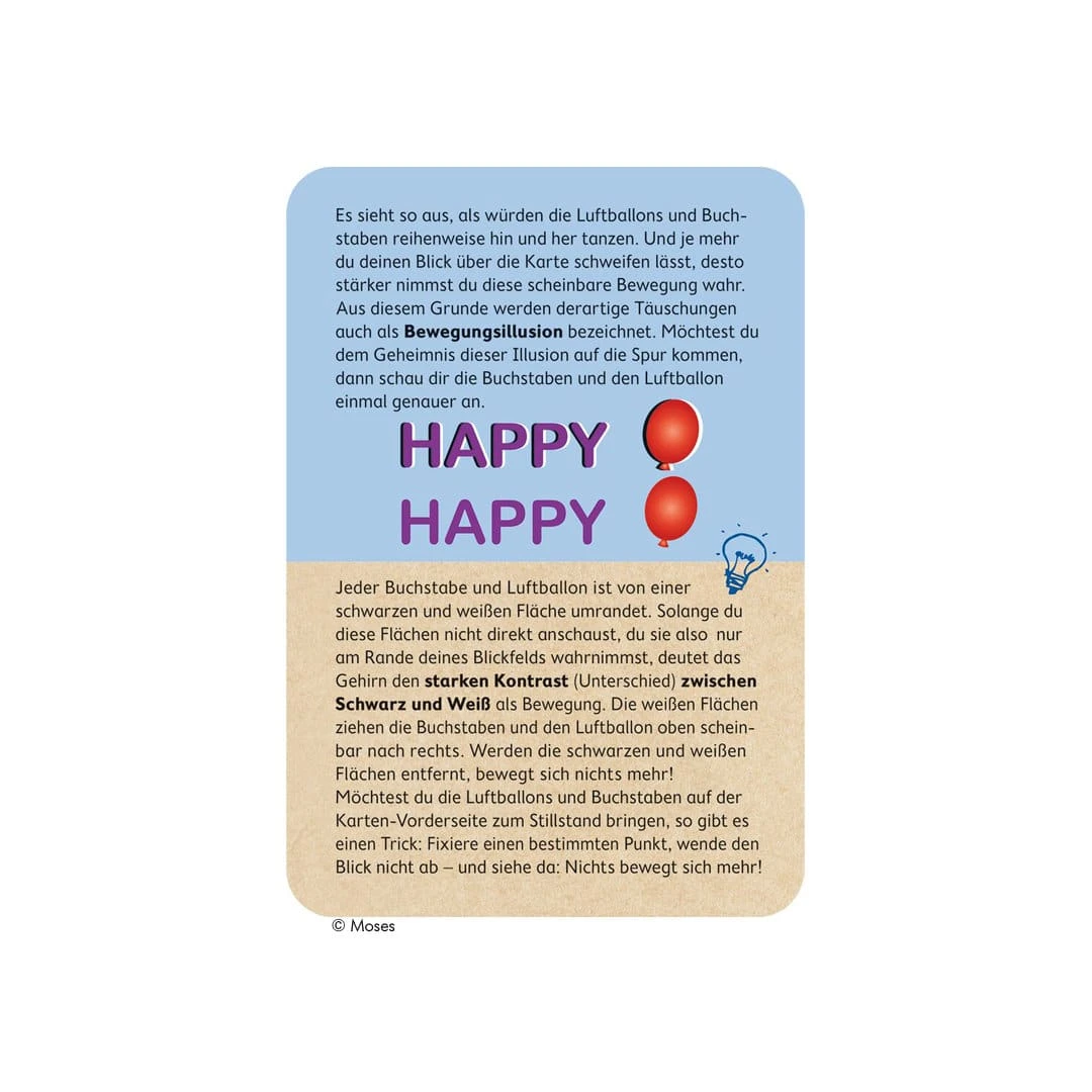 In diesem Kartenset findet ihr dazu 50 verblüffende Grafiken, die die Augen täuschen und dazu weitere 25 spannende Experimente, die interessante optische Illusionen erlebbar machen. Außerdem werden die Phänomene ausführlich und verständlich erklärt.
