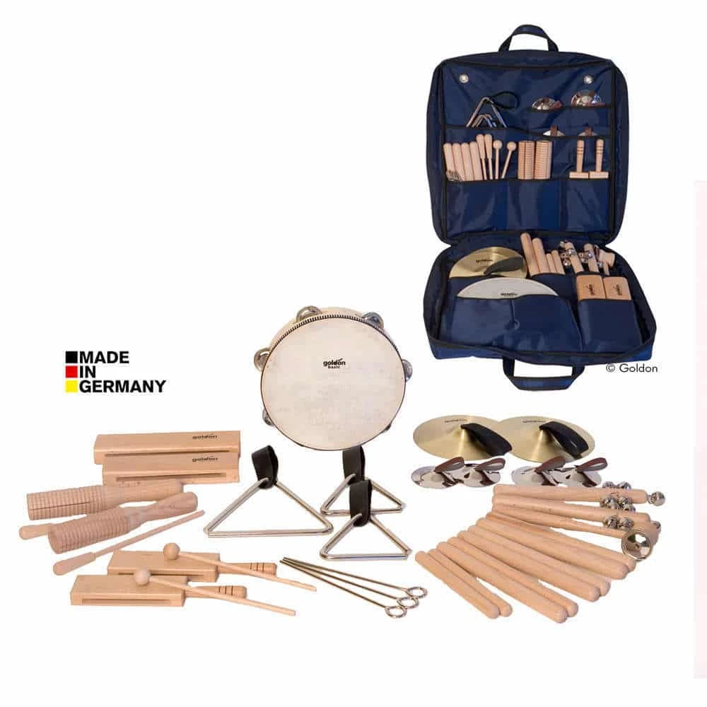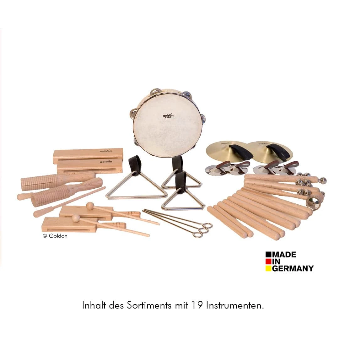 Dieses Percussion-Set besteht aus 20 Instrumenten zum rhythmsichen Musizieren in Gruppen. Die Musikinstrumente sind von hoher Qualität und halten Belastungen, wie sie in Schule und Kindergarten üblich sind, problemlos stand.