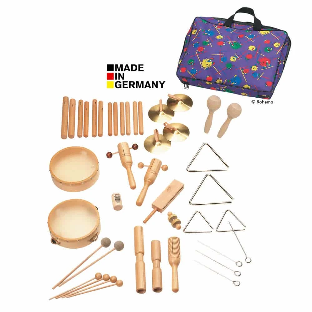Percussion-Set mit 24 Musikinstrumenten in strapazierfähiger Rhythmus-Tasche.