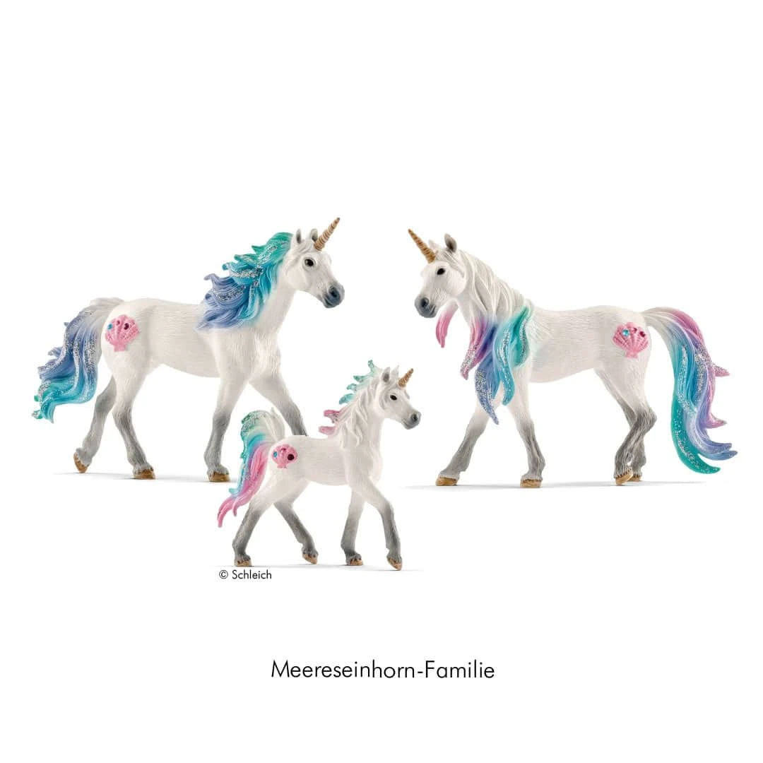 Tief verborgen in den Meeres-Wäldern von Meamare, der Unterwasserwelt von Bayala, lebt eine Einhorn-Familie. Mit etwas Glück und Geduld kann man die scheuen Tiere entdecken und vielleicht sogar Freundschaft schließen. Unter Meerjungfrauen wird erzählt, dass die Einhörner zur Sonnenwende an Land gehen können. Auf ihrem Fell haben die Meeres-Einhörner eine wundervolle Zeichnung und ihr Schweif und ihre Mähne glitzern nicht nur im Mondschein…