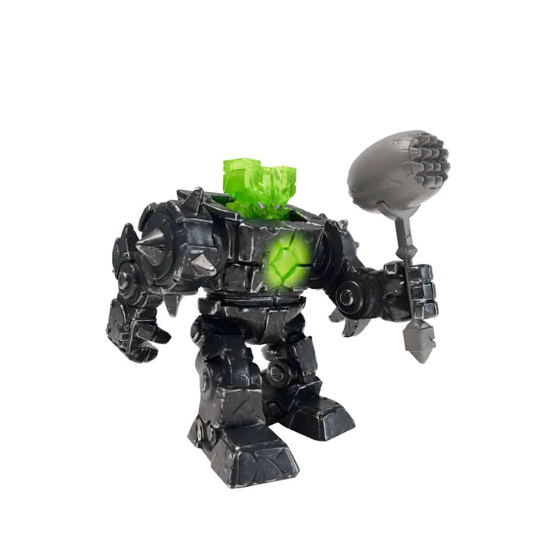 mächtiger, grau-schwarzer Schatten-Stein-Roboter mit beweglichen Armen und austauschbarem Steinhammer als Waffe sowie einer austauschbaren grünen Mini-Figur “Schatten Stein-Lord” zum Hineinsetzen,