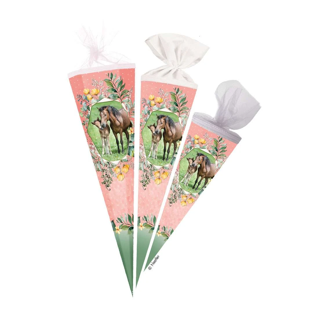 Schöne Zuckertüte für Mädchen mit zwei Pferden, in Rosa-Tönen.