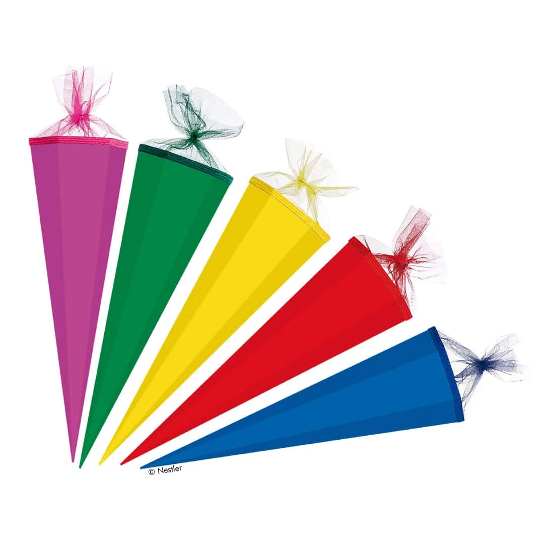 Wer seinem Kind eine individuelle Schultüte basteln möchte – bekleben, bemalen, bestecken, besprühen -, nimmt am besten eine einfarbige, um möglichst viel Spielraum beim Gestalten zu haben. Diese Bastelschultüten haben jeweils einen Filzverschluss, der farblich auf die Farbe der Zuckertüte abgestimmt ist.