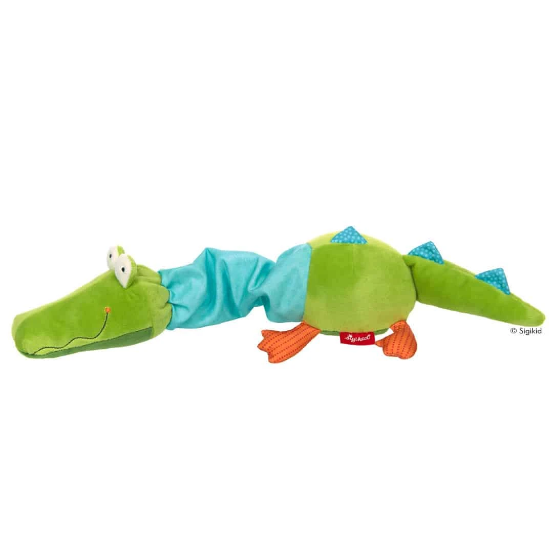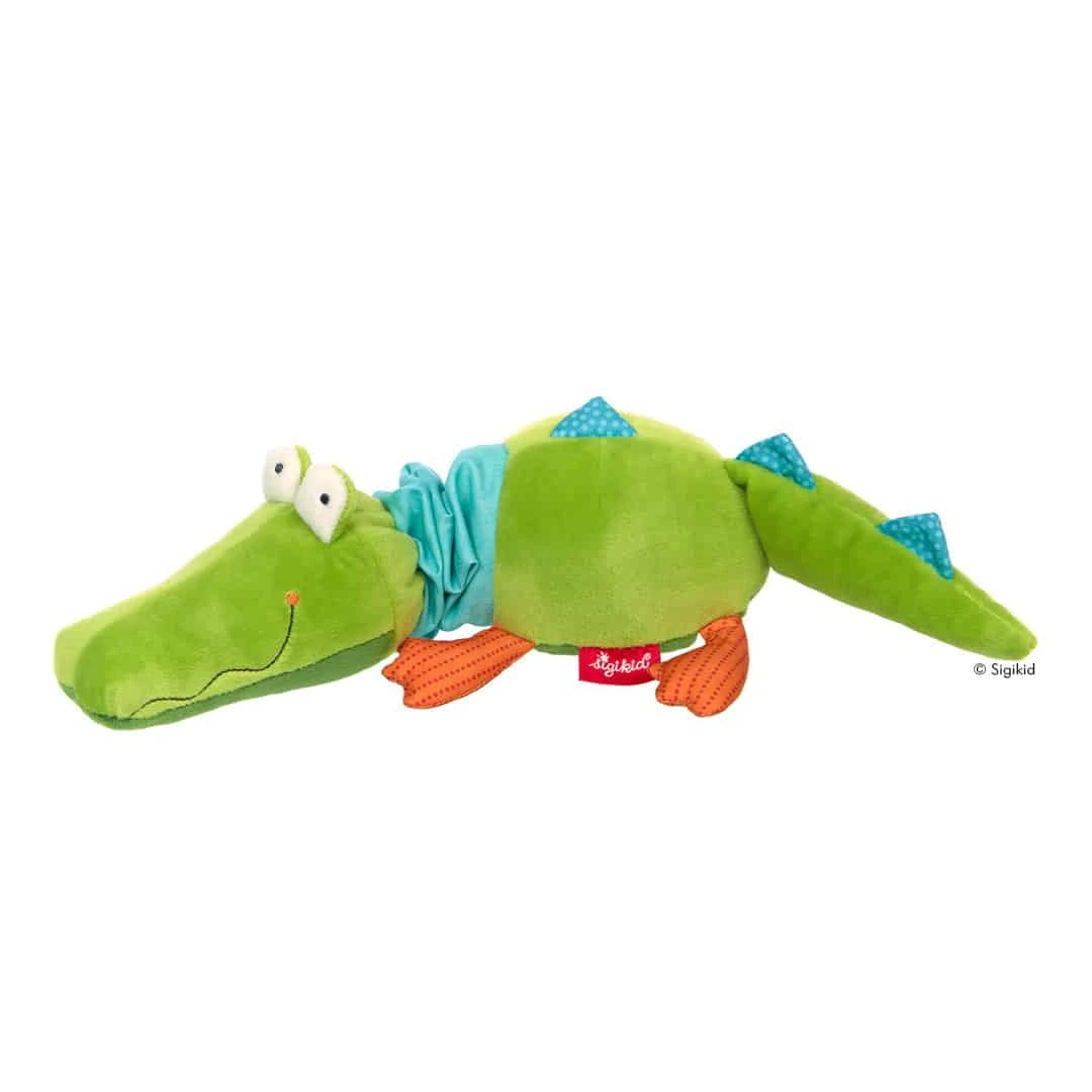 Weiches Kuscheltier Krokodil als Auszieh-Spielzeug mit Spieluhr. Als Wegbegleiter und Einschlafhilfe.