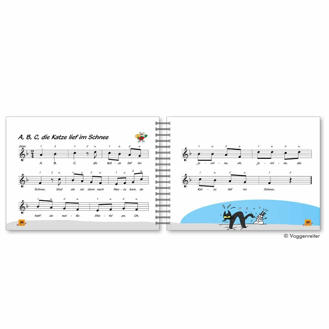 Spannenlanger Hansel; Lirum, larum, Löffelstiel; Ein Männlein steht im Walde; Der Frosch; Bim, bam, beier; Froh zu sein, bedarf es wenig; In meinem kleinen Apfel; Hampelmann; Drei Chinesen mit dem Kontrabass; O du lieber Augustin; Ringel, Ringel, Reihe; Im Märzen der Bauer; Der Herbst ist da; Es regnet; Der Winter ist ein rechter Mann; April, April; Alles neu macht der Mai; A, B, C, die Katze lief im Schnee; Schneeflöckchen, Weißröckchen; O wie ist es kalt geworden; Hoppe, hoppe Reiter; Suse, liebe Suse, was raschelt im Stroh; Wenn ich ein Vöglein wär’; Hopp, hopp, hopp; Widewidewenne; Der Frosch ist krank; Zwischen Berg und tiefem Tal; Kommt ein Vogel geflogen; Weißt du, wieviel Sternlein stehen; Der Mond ist aufgegangen; O wie wohl ist mir am Abend; Stehn zwei Stern; Kindlein mein; Die Blümelein, sie schlafen; Guter Mond, du gehst so stille; Der Sandmann ist da; Schlaf, Kindlein, schlaf; Morgen kommt der Weihnachtsmann; Laßt uns froh und munter sein; Alle Jahre wieder; O du fröhliche; Wir sagen euch an; Ihr Kinderlein kommet; Vom Himmel hoch; Zum Geburtstag viel Freud’; Viel Glück und viel Segen; Wir feiern heut’ Geburtstag; Zum Geburtstag viel Glück.